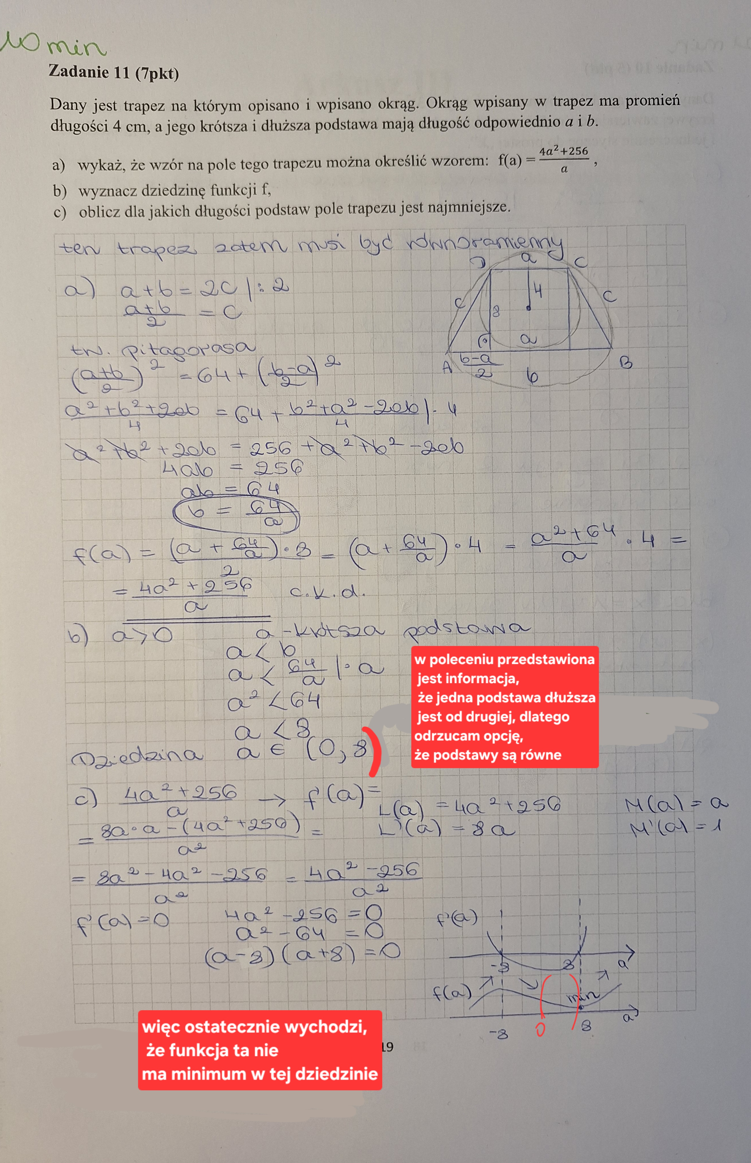 Dany jest trapez na którym opisano i wpisano okrąg. Okrąg wpisany w trapez ma promień długości 4cm. Dla jakich długości podstaw pole trapezu jest najmniejsze?