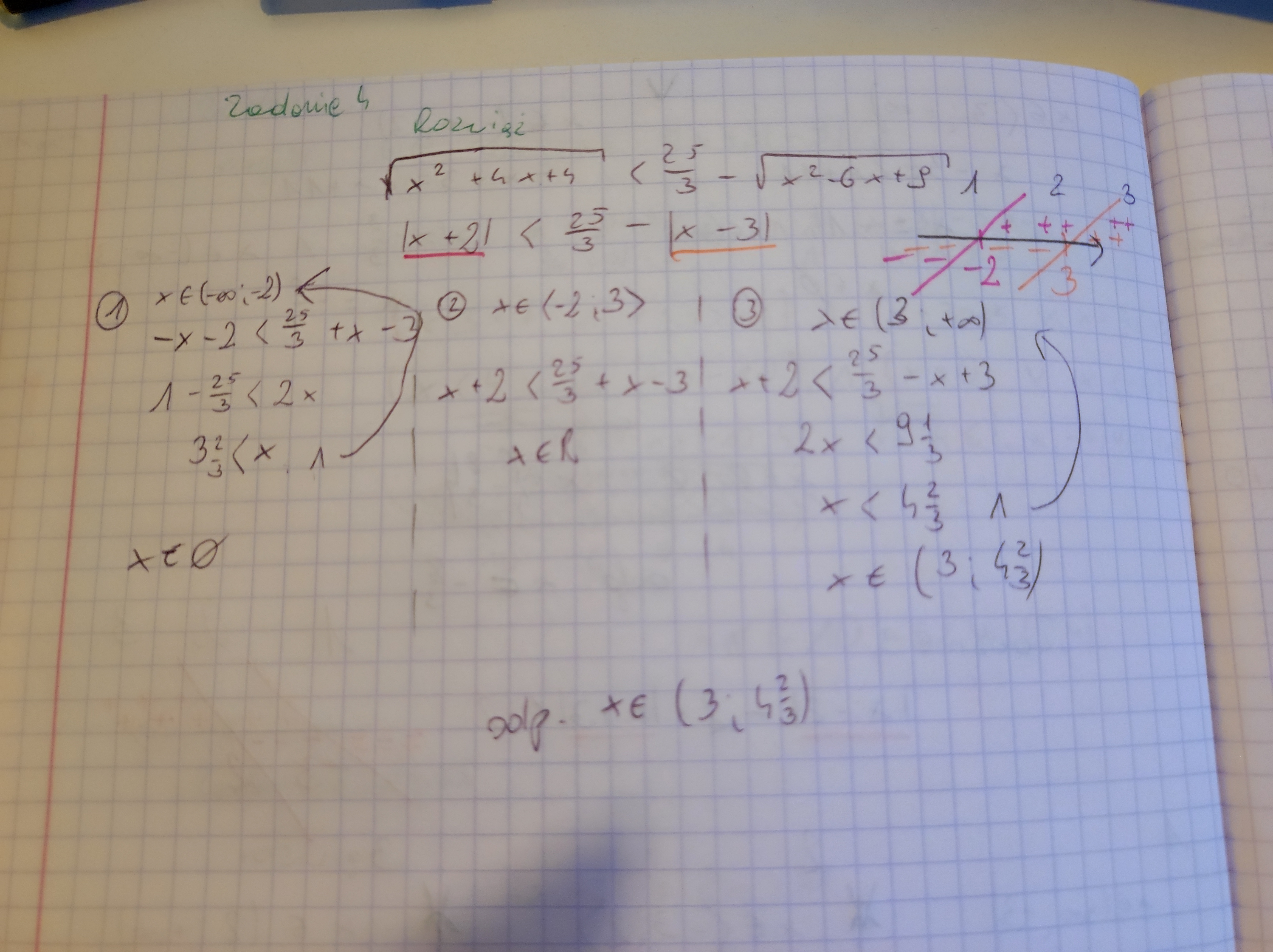 w 1 zbiorze masz zły wynik, pomyliłaś rachunki, a w 2 musisz w odpowiedzi uwzględnić zbiór w jakim rozwiązujesz, jeśli x należy do rzeczywistych to rozw. jest cały przedział w którym sprawdzasz czyli od -2 do 3 obustronnie domknięty