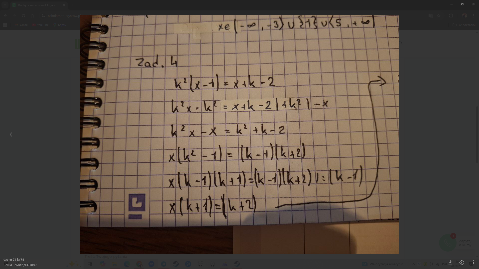 Równianie ma jedno rozwiązanie kiedy a czyli twoje k+1 nie równa sie zeru czyli k nie równa się -1. Wtedy jak wiesz że to nie wyjdzie zero to możesz podzielić przez k+1 i wychodzi ci x=(k+2)/(k+1)