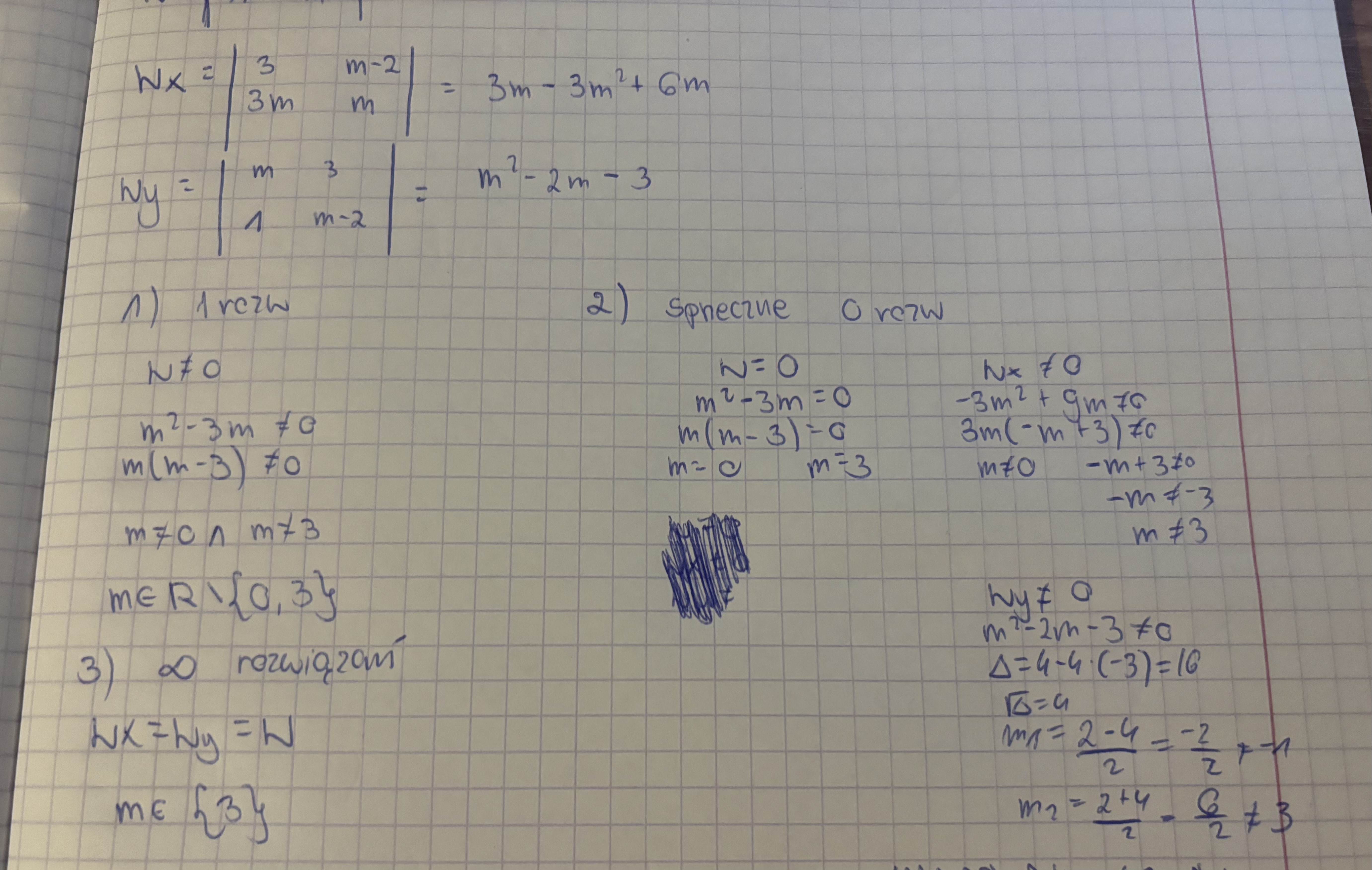 Tam przy warunku na Wx różne od 0 wyszło Ci, że m musi być różne od 3, więc wykluczasz tą trójkę