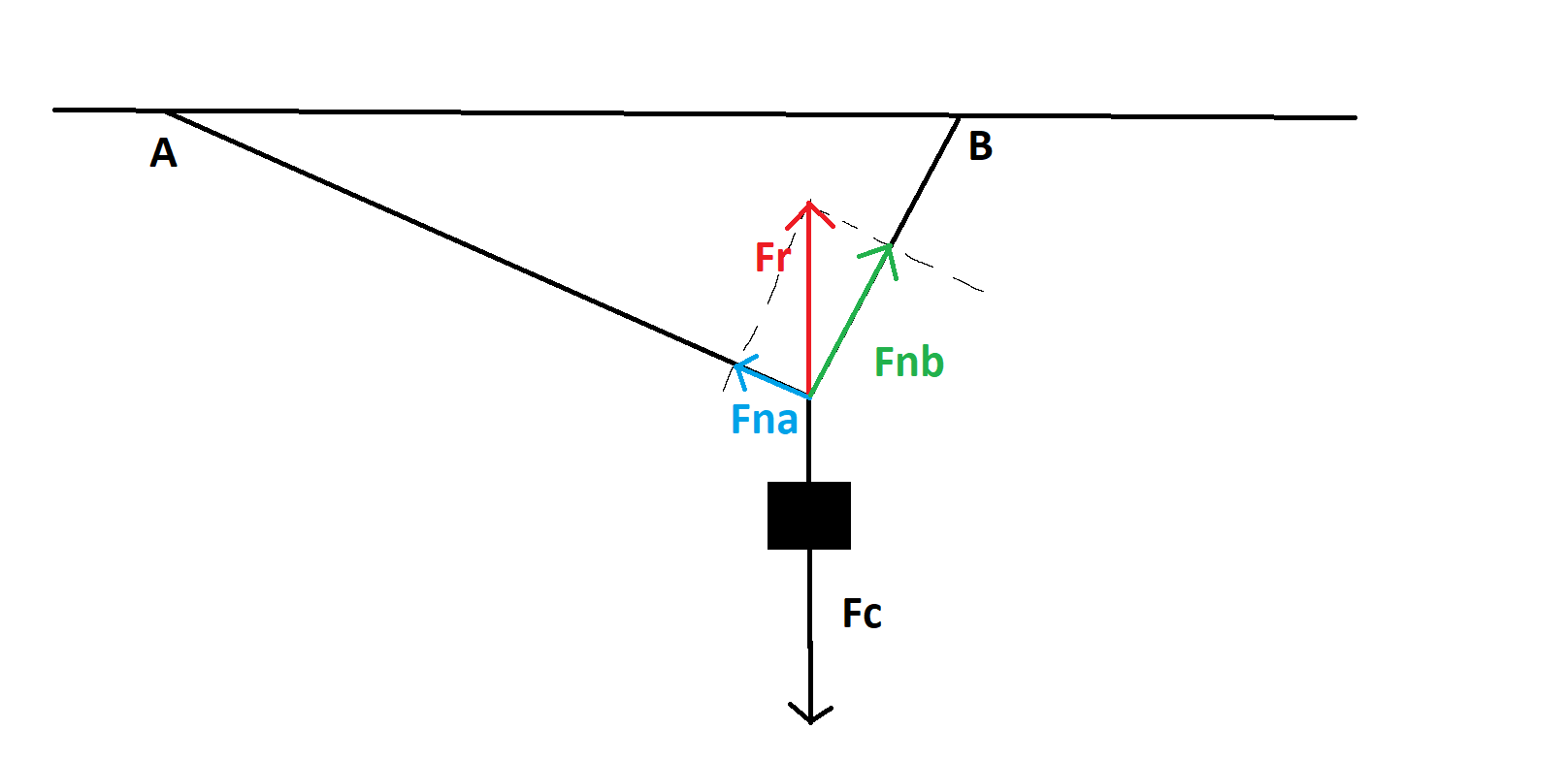 Rozpisałem siły tak jak na rysunku: Fr równoważy Fc tak aby ciężarek pozostawał w spoczynku. Fr rozpisałem na dwie siły naciagu linek. Nie wiem jednak jak dojść do wyznaczenia sił naciągu w punktach A i B. Czy dobrze rozpisałem te siły i czy prowadzą one do rozwiązania?.