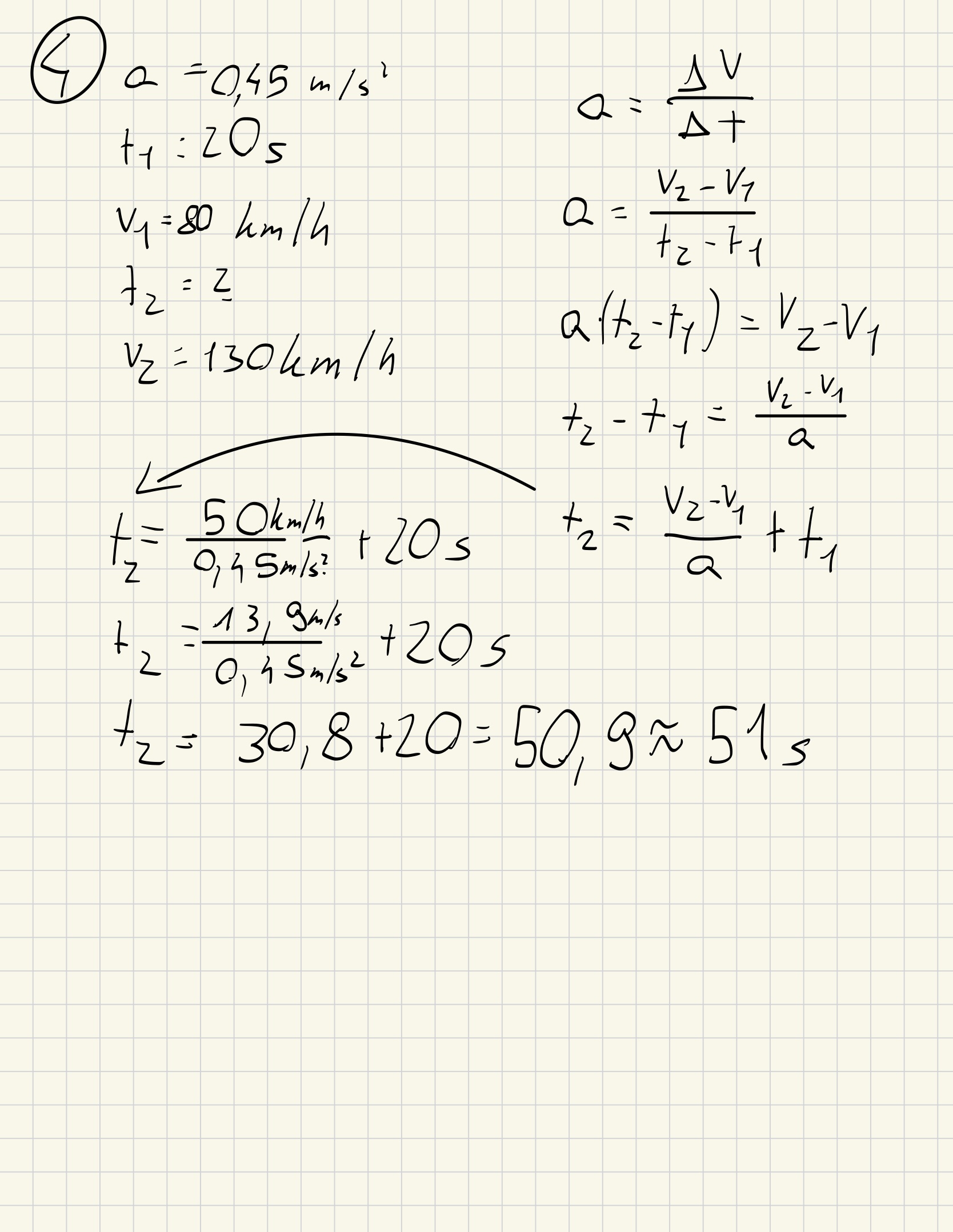 No cóż, autor miał tu na myśli dopasowanie prostej i odczytanie z wykresu czasu, w którym ta prosta przetnie się z wartością prędkości równą 130 km/h, więc w istocie tak jak Wojtek napisał mogłoby to na maturze nie zostać uznane (choć być może odwołanie przyniosłoby tu jednak punkty). Tak na dobrą sprawę kluczową sprawą jest to jaki został podany "czasownik" w kwestii tego co należy w zadaniu zrobić. Jeśli w zadaniu mają się pojawić obliczenia, to w poleceniu padnie słowo "oblicz" - tutaj zaś pojawia się hasło "ustal na podstawie wykresu", które sugeruje raczej, że nie należy tu właśnie wykonywać obliczeń. Więc sprawa faktycznie nie zawsze jest taka oczywista, ale spojrzenie na ów "czasownik" może nam pomóc w tym jaki sposób podejścia do rozwiązania będzie dobry.