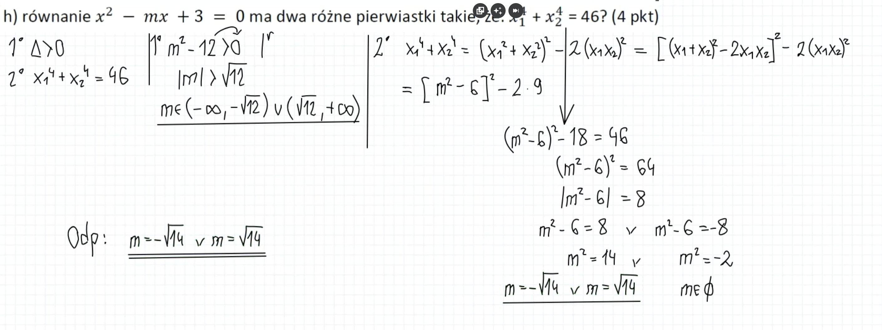 Witam, czy może mi ktoś podpowiedzieć, dlaczego w tym zadaniu końcową odpowiedzią jest m=-√14 lub m=√14, a nie część wspólna wyników z warunku 1 i 2? Z góry dziękuję za odpowiedź.