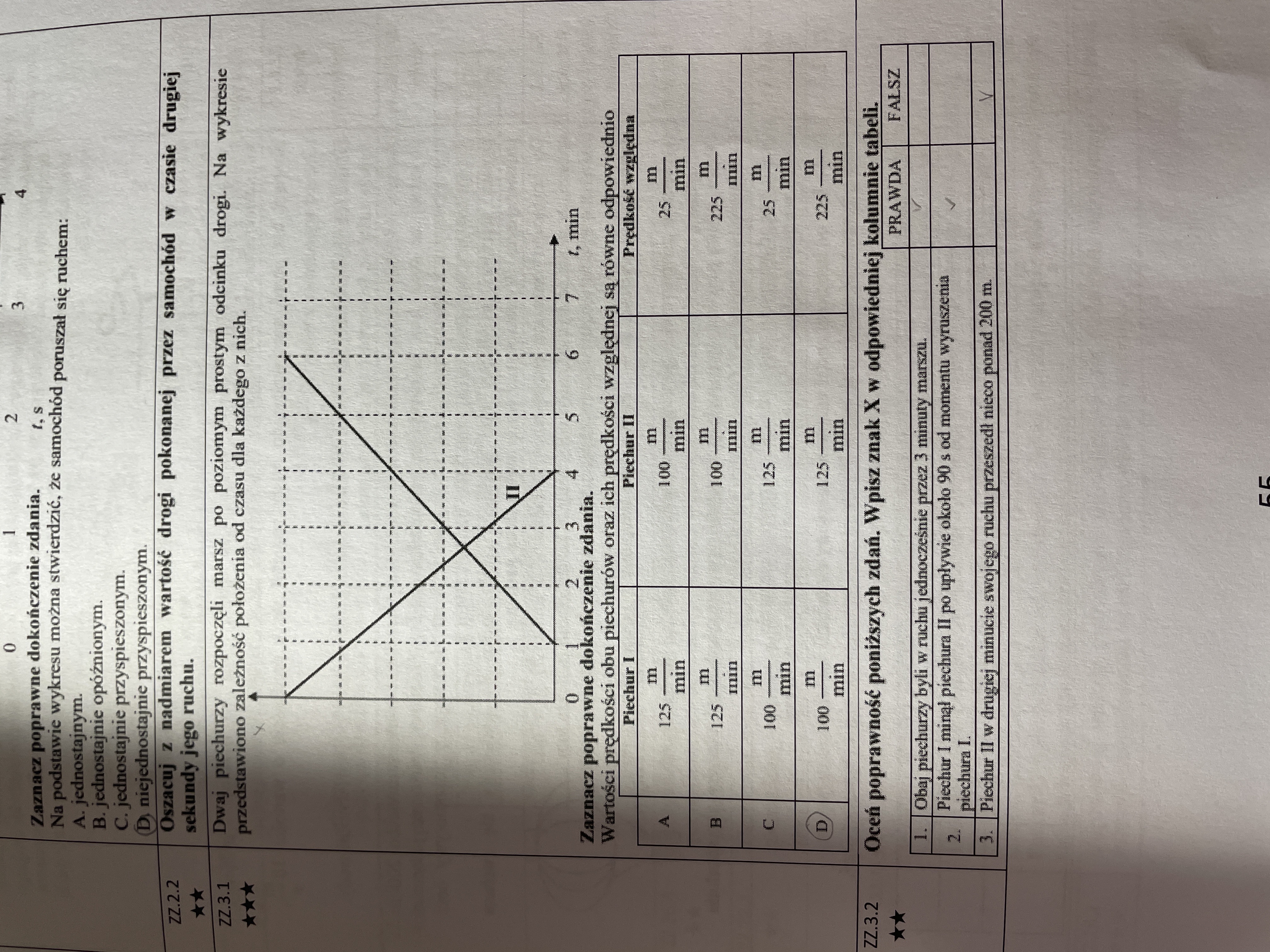 Ostatnie zdanie z pp 2) to fałsz, bo wiedząc już, że prędkość piechura II to było 125 m/min, zauważamy, że w każdej minucie ruchu pokonuje on 125 metrów. A to oznacza, że w drugiej minucie ruchu też przeszedł on dokładnie 125 metrów. Gdyby zdanie brzmiało np. "piechur po dwóch minutach swojego ruchu przeszedł ponad 200 m), to wtedy faktycznie byłoby ono prawdziwe.