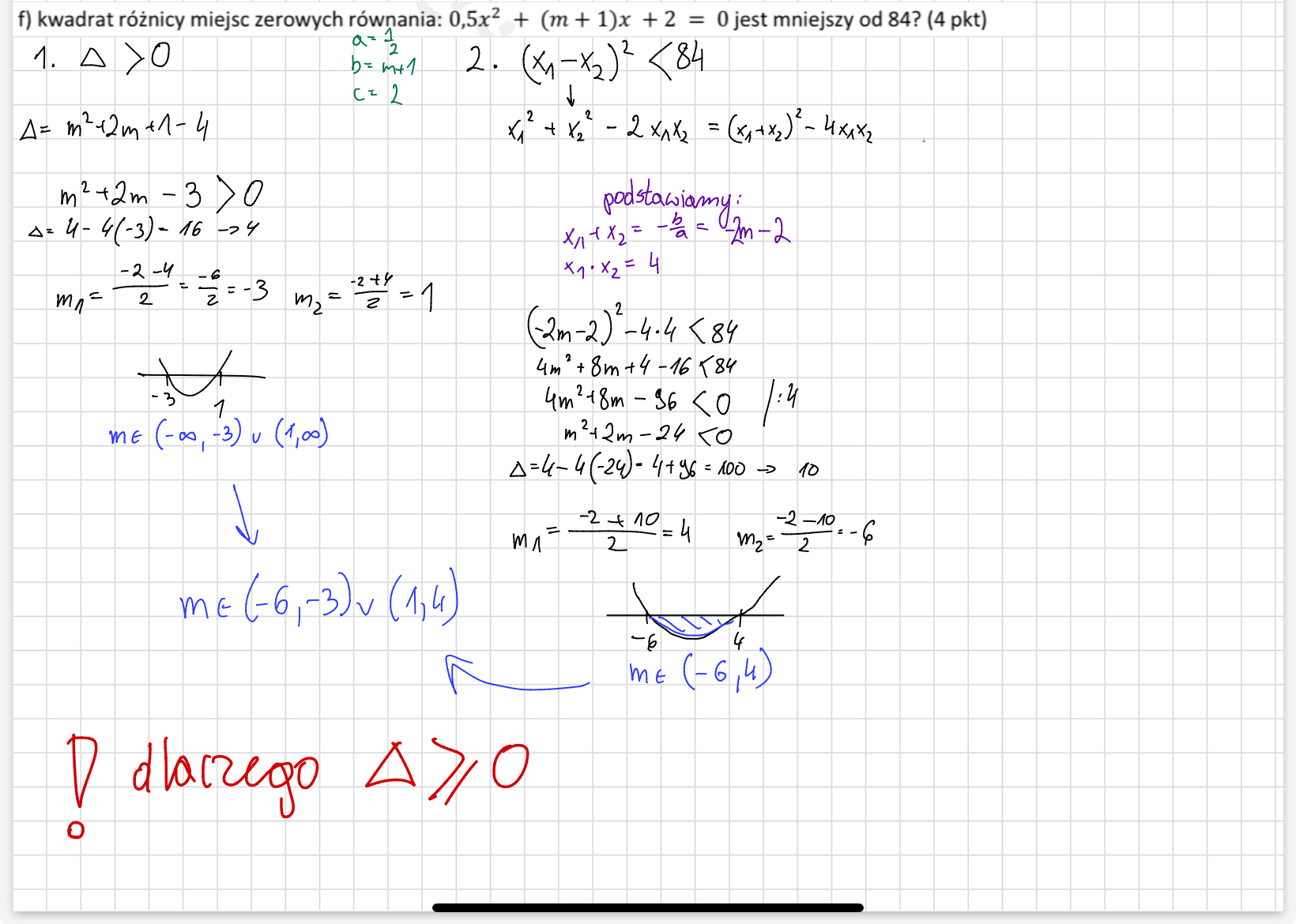 chodzi o to, że w poleceniu nie jest napisane że mają być dwa rozwiązania więc wtedy musisz rozpatrzeć opcję gdy oba rozwiązania są takie same czyli jest tak naprawdę jedno rozwiązanie więc delta większa równa zero