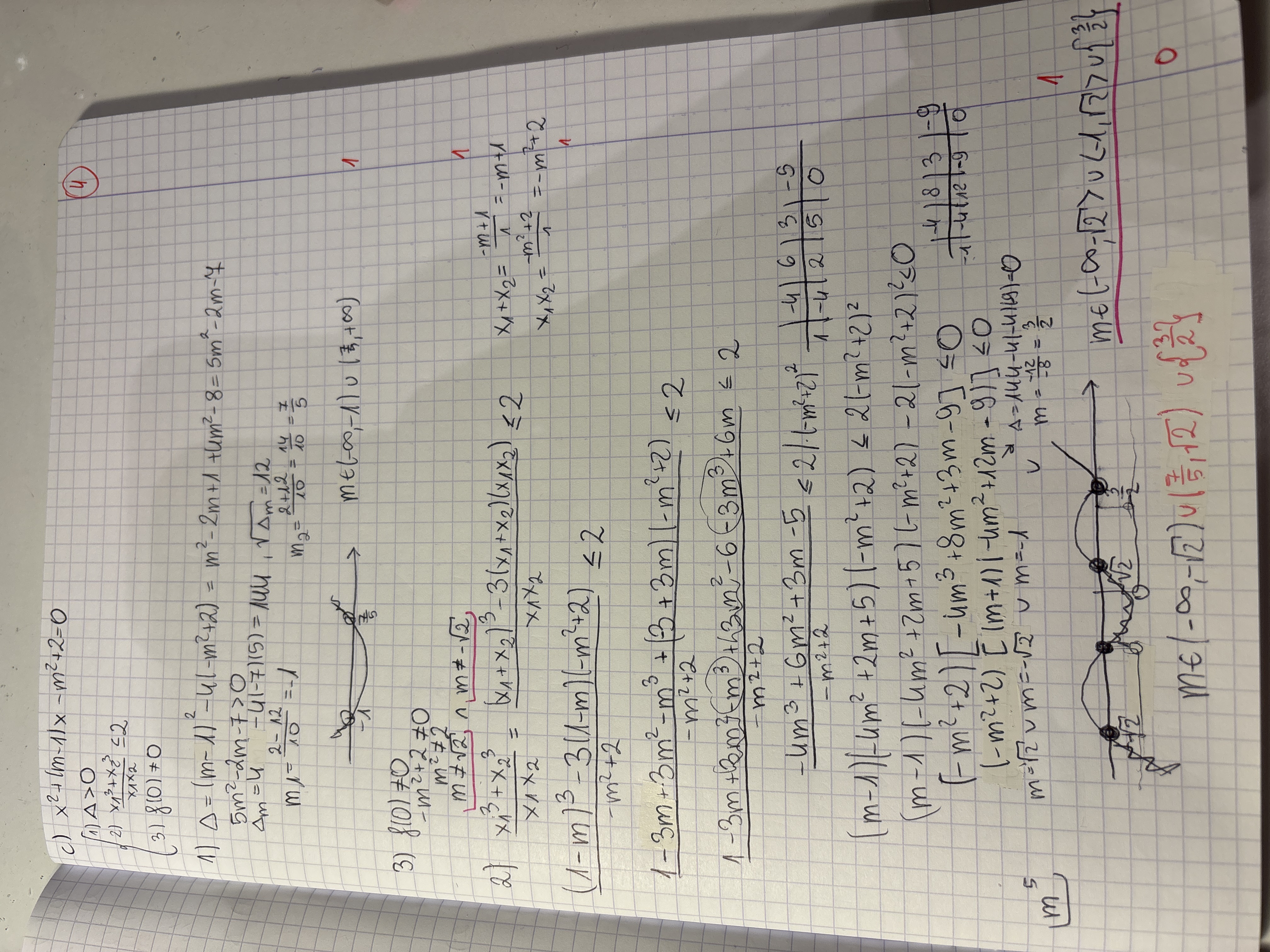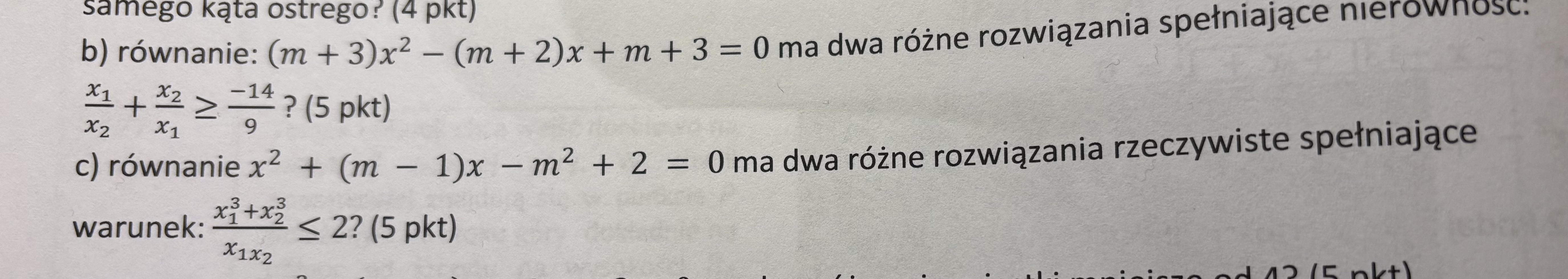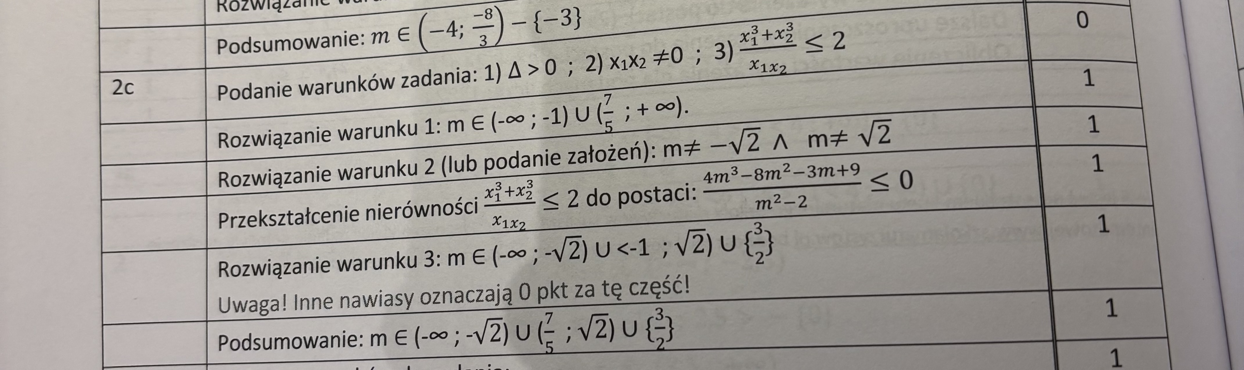 Mam pytanie czy można ten warunek (ze m nie może być równe pierwiastek z 2 i minus pierwiastek z 2) uwzględniać dopiero w odpowiedzi? Bo w kryteriach do zadania jest że mam dać sobie 0 za nieuwzględnienie ich już wcześniej i nie wiem. Chodzi o te rzeczy podkreślone na różowo