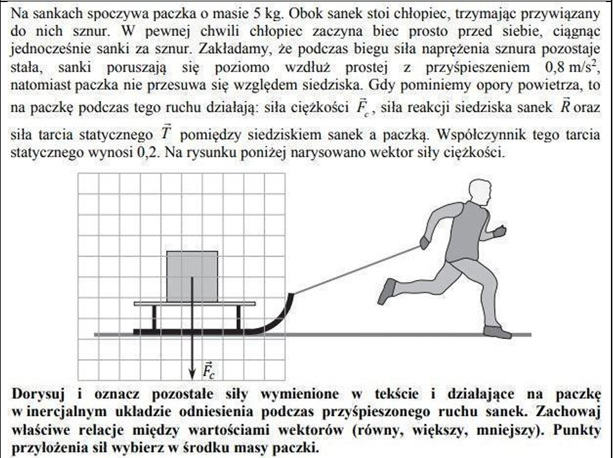1.2 Oblicz wartość siły tarcia statycznego działającej na paczkę podczas przyśpieszonego ruchu sanek, w sytuacji opisanej w zadaniu 1.