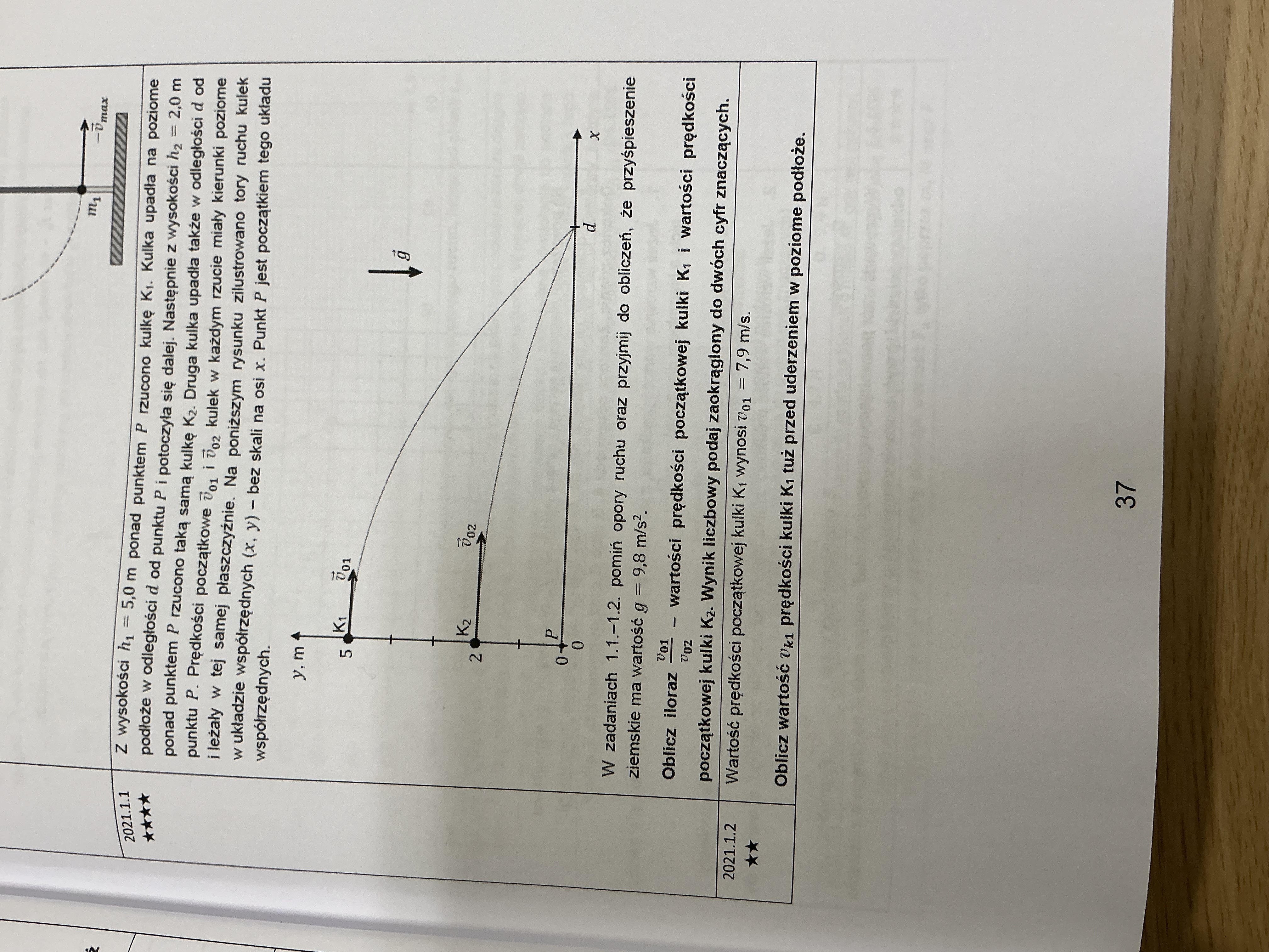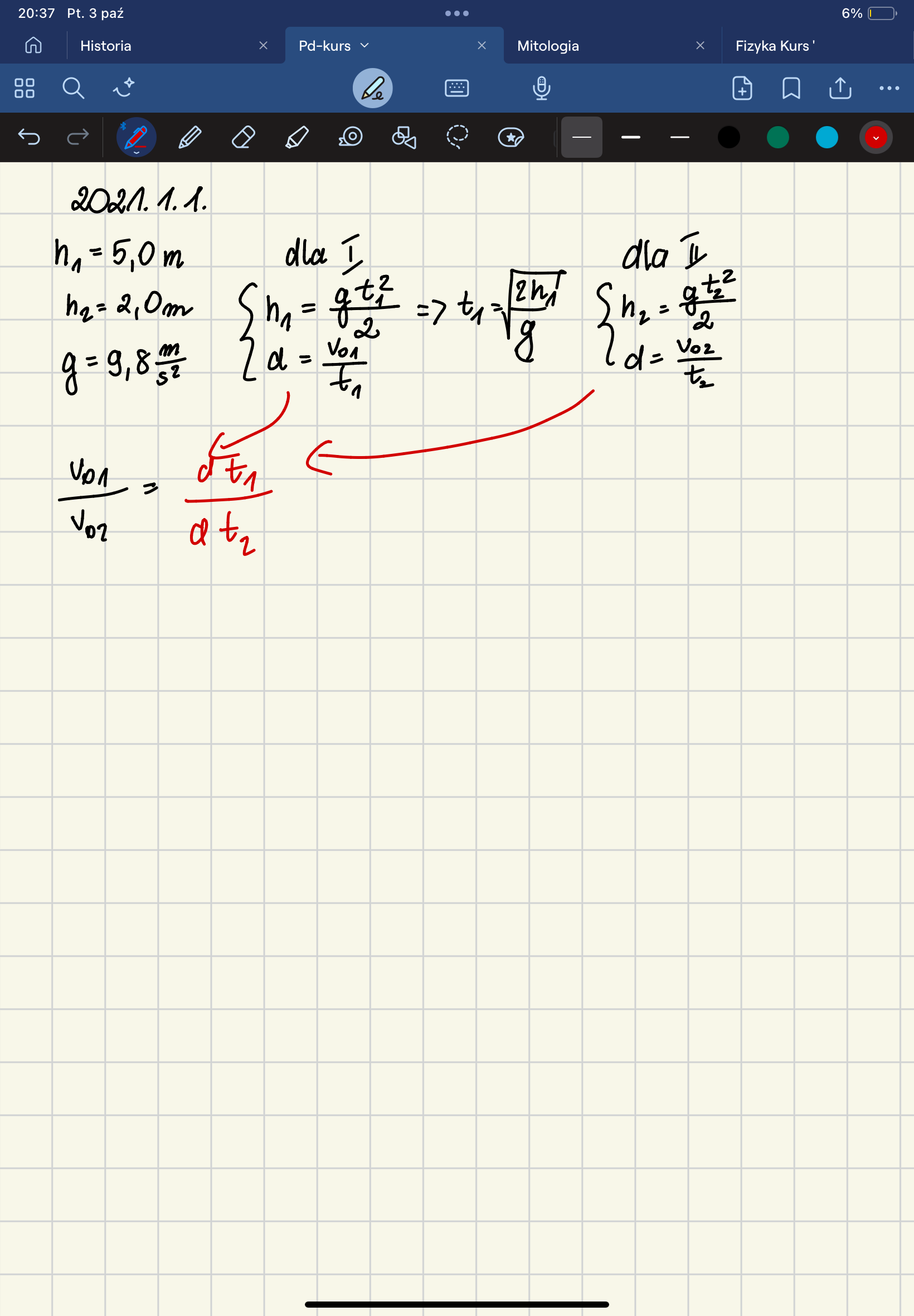 Metoda jest jak najbardziej dobra, natomiast masz tutaj banalną pomyłkę w zapisie wzoru na drogę przebytą w poziomie - mianowicie droga w ruchu jednostajnym to przecież s = v*t, a nie s = v/t ;) czyli wzory na d powinny wyglądac następująco: d = v01*t1 i d = v02*t2, a stąd v01 = d/t1 i v02 = d/t2. Jeśli użyjesz tych poprawnych już wzorów w swojej metodzie to dojdziesz do dobrego wyniku :)