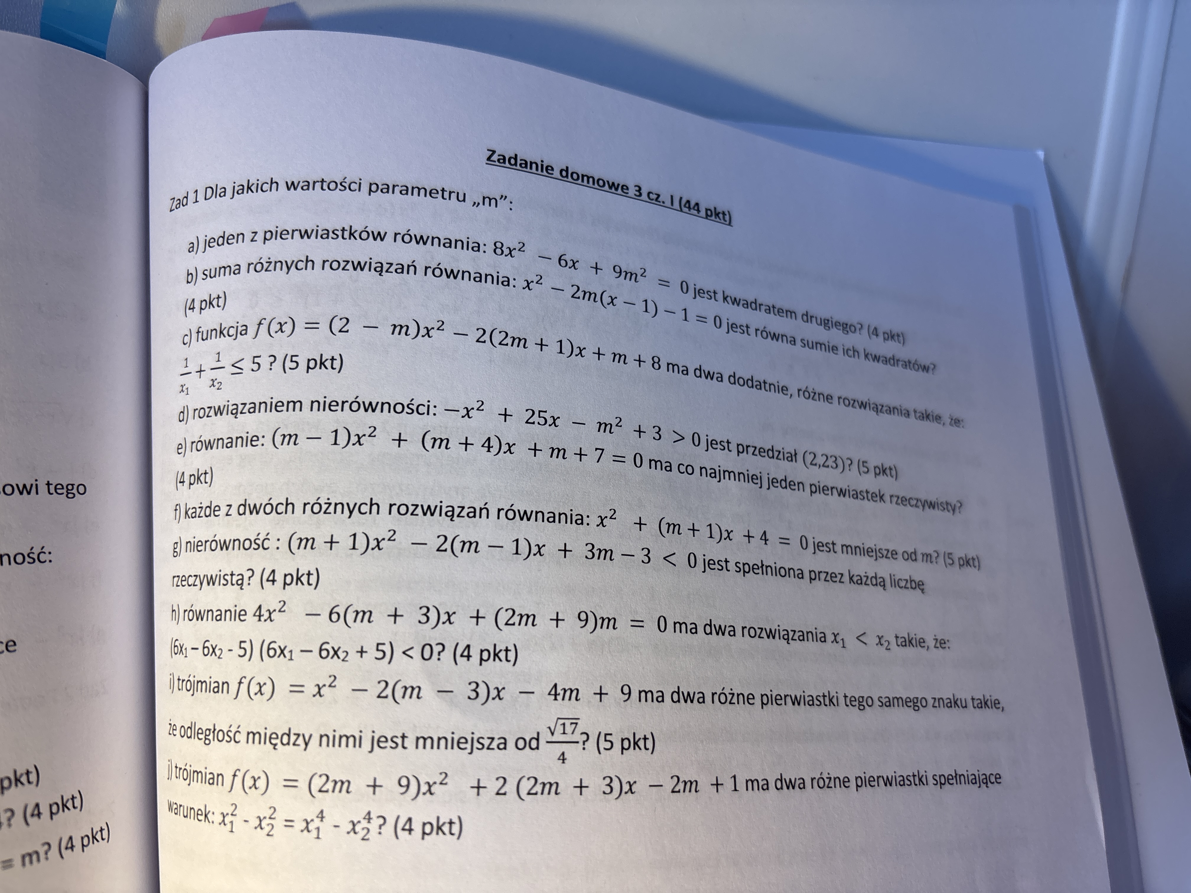 Masz mieć co najmniej 1 więc masz opcję że to jest f kwadratowa i wtedy a różne od 0 i delta większa lub równa