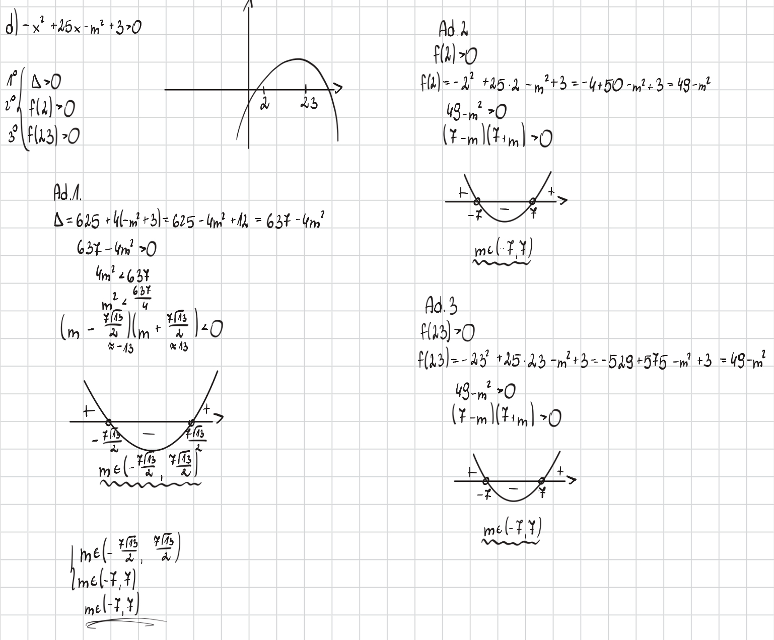 Jak sobie zapiszesz warunki 2. I 3. Nie jako nierówności ale jako równania to wtedy będzie git. Bo 2 i 23 s miejscami zerowymi tylko nie wchodzą w przedział no bo one są na 0 a przedział jest >0