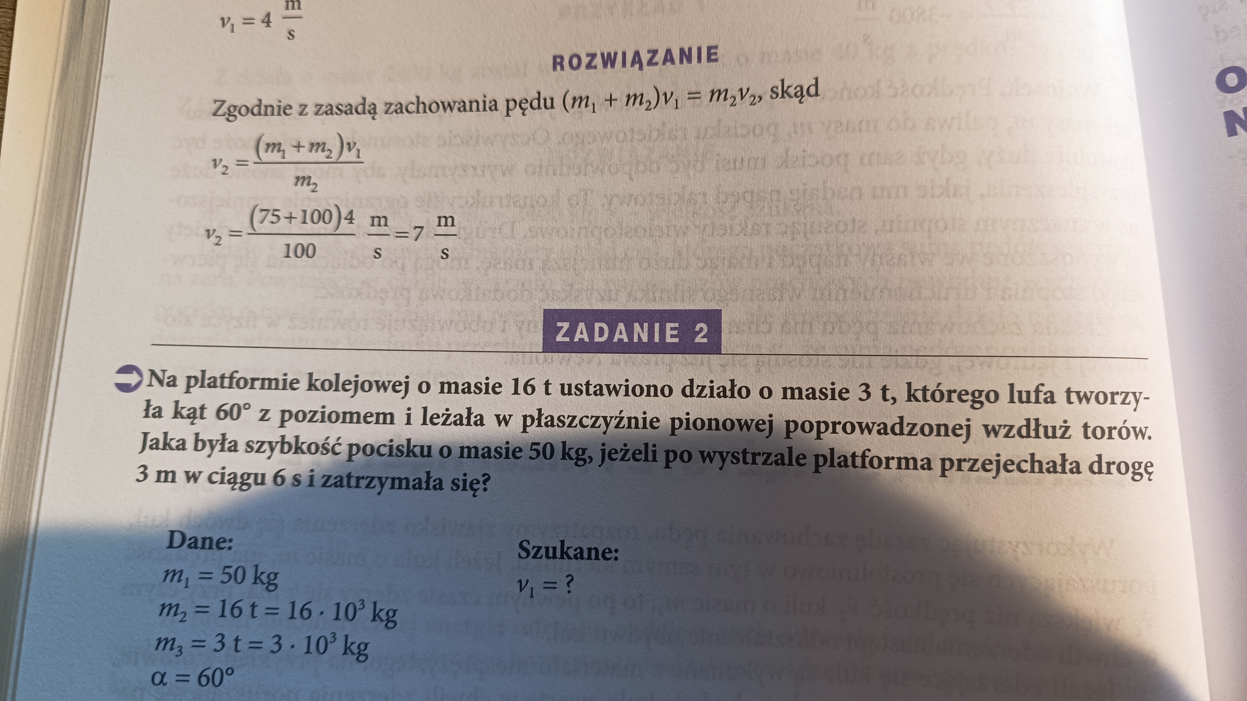 Tego typu problemy będziemy rozważać w tym tygodniu na naszych zajęciach :) ale chodzi o to, że jeśli w istocie poprawnie zapiszesz zasadę zachowania pędu (uwaga na rozkład na składowe!), to otrzymasz wzór na prędkość pocisku uzależnioną od prędkości odrzutu platformy. A ponieważ wiesz jaką drogę pokonała platforma i po jakim czasie się zatrzymała, to z kinematycznych równań ruchu dla ruchu jednostajnie opóźnionego (musimy zalożyć, że taki on był), będziesz w stanie obliczyć jej prędkość początkową v0 - to będzie właśnie ta prędkość odrzutu platformy. Wrzucisz ją do uzyskanego wzoru wynikającego z zasady zachowania pędu i będziesz miał prędkość pocisku.