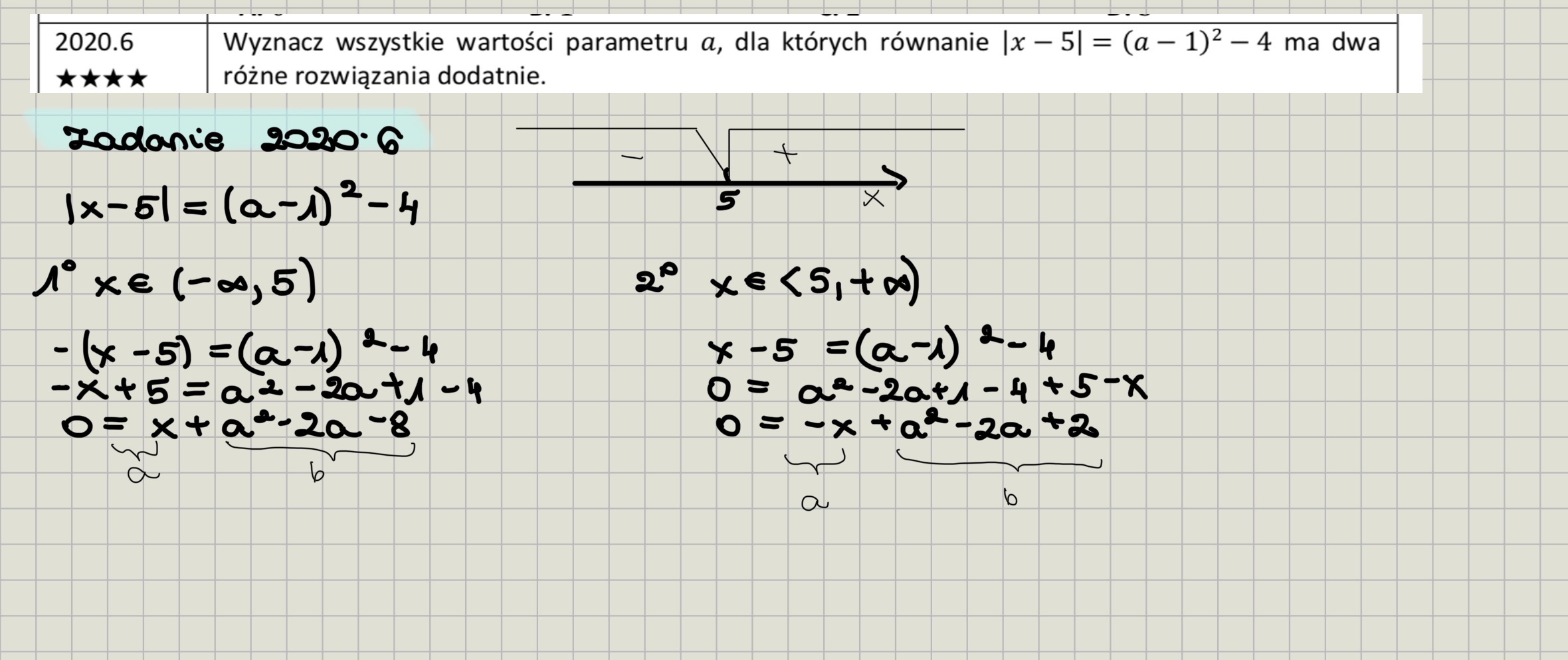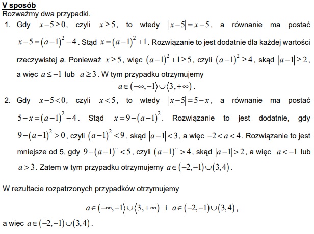 Próbowałam zrobić te zadanie tak jak tradycyjne równanie z wartością bezwzględną, czyli początkowo wyrażenie (a-1)^2-4 wzięłam za jakąś zwykłą liczbę i rozpatrzyłam dwa przypadki w zależności od tego czy pod wartością bezwzględną byłaby wartość dodatnia, czy wartość ujemną.