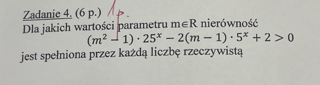 Tutaj może też być ten drugi przypadek, gdy b>0, dlatego że t>0 dla każdego x rzeczywistego ( 5^x jest zawsze dodatnie), więc dla m=-1 będzie: 4t+2>0 => t>-0,5, co jest prawdą bo t>0.
