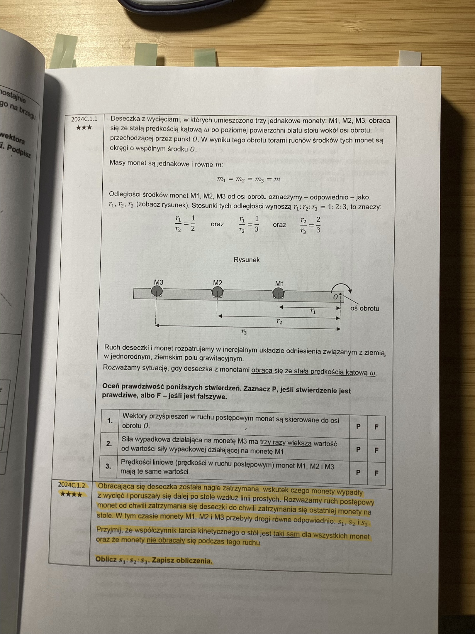 Należy zauważyć, ze w tych wzorach na drogę, które masz po lewej stronie czasy w każdym przypadku są przecież różne (swoją drogą we wzorze na s3 w ostatecznej postaci zgubiłeś przemnożenie przez ów czas). Czyli w s1 pojawia się t1, w s2 pojawia się t2 itd. Swoją drogą te czasy masz poprawnie wyznaczone po prawej stronie. Jeśli do tego zauważysz, że skoro współczynniki tarcia dla wszystkich monet są takie same, to działające na nie siły tarcia muszą być takie same, a zatem opóźnienia jakie posiadają te monety również są takie same, więc a1 = a2 = a3. Jeśli zatem teraz np. wstawisz do wzorów na drogę wzory na czasy t1, t2 i t3, to otrzymasz poprawne wzory na drogi i stąd faktycznie zobaczysz, że ów stosunek będzie równy 1:4:9.