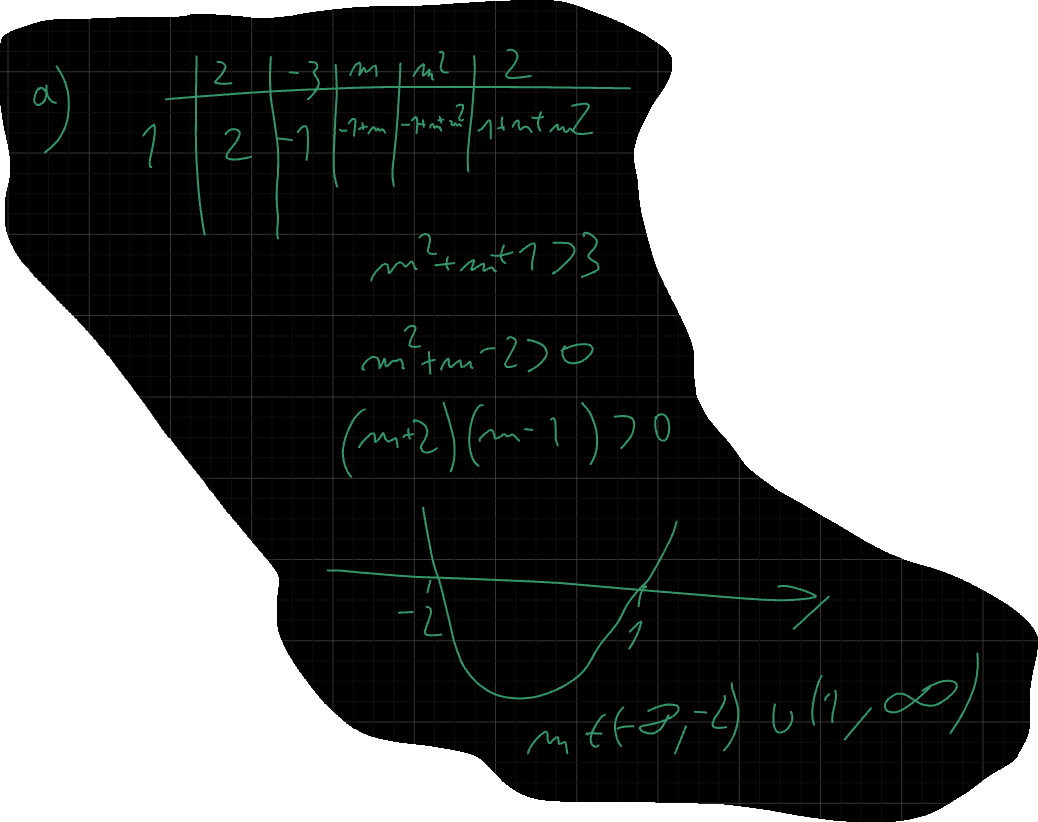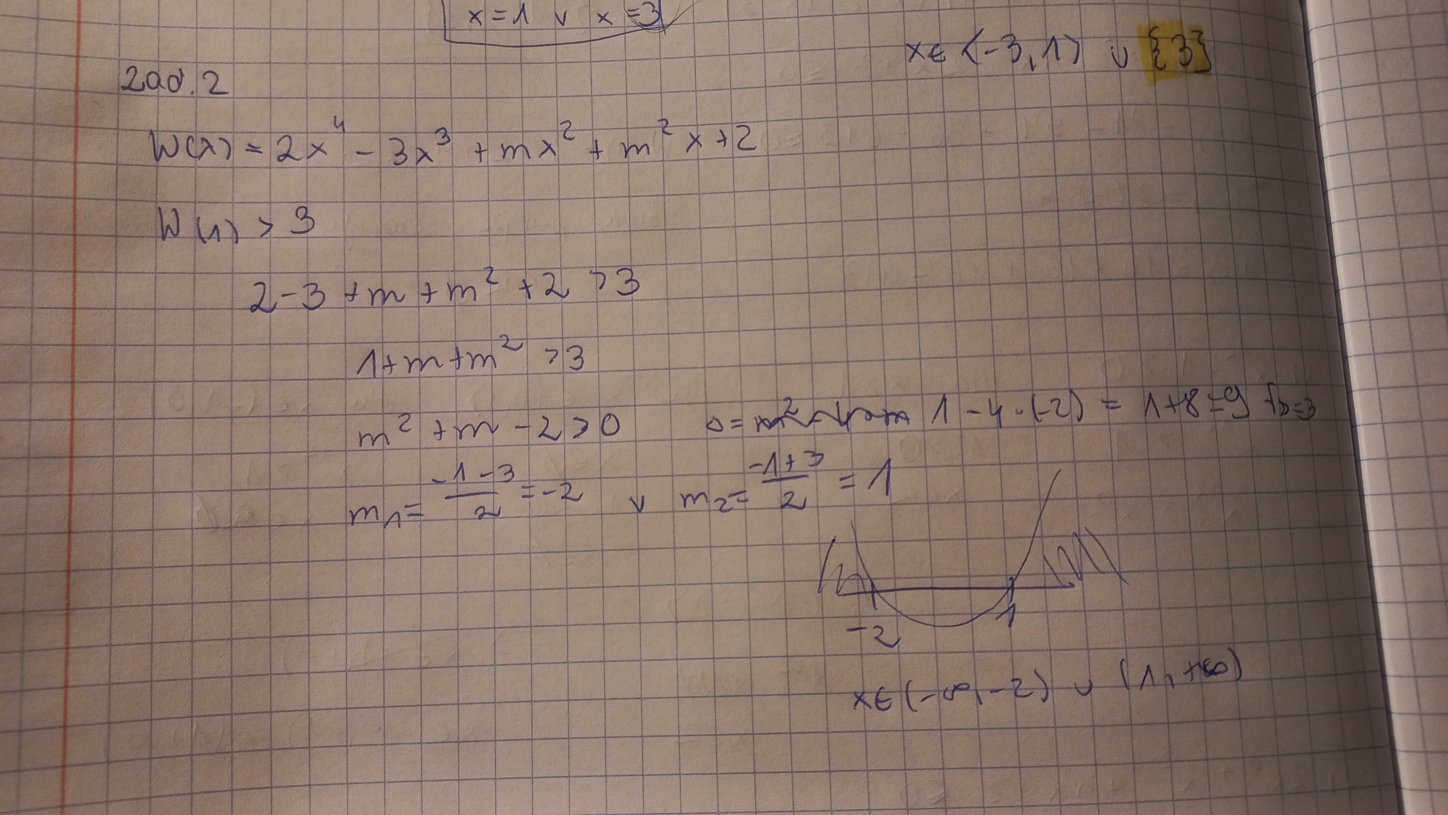 Dla jakich wartości parametru m reszta z dzielenia W(x)=2x⁴ - 3x³ + mx² + m²x + 2 przez dwumian x - 1 jest większa od 3?
