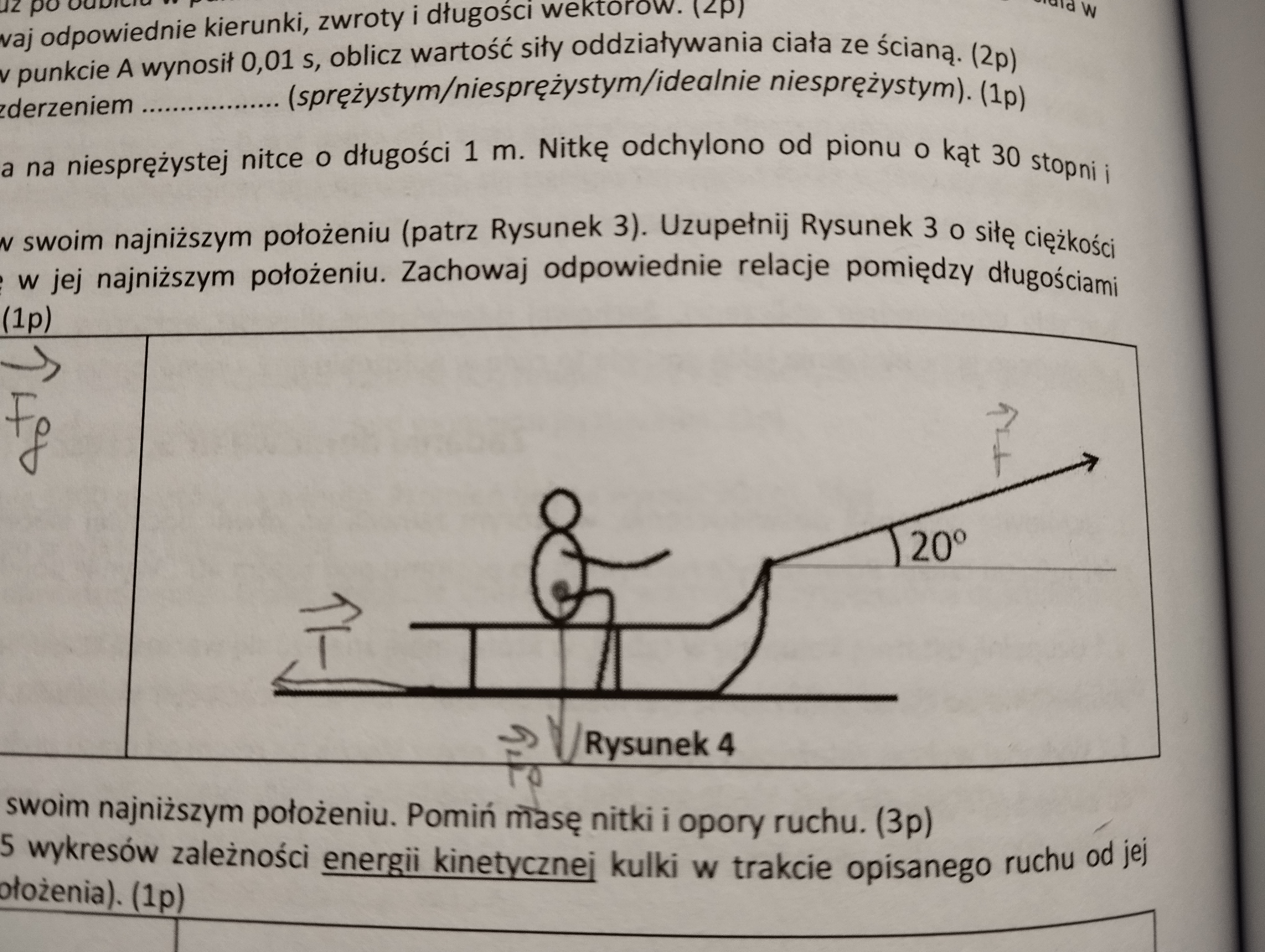 To zadanie jest analogiczne do tego, które robiliśmy na zajęciach nr 3. trzeba zatem przede wszystkim rozbić sobie siłę F na składowe. I wtedy zauważymy, że w pionie na sanki będą działały siła ciężkości (w dół) i składowa Fy oraz siła reakcji (obie w górę). Z trygonometrii dostaniemy, że Fy = F*sin(20), a to oznacza, że siła reakcji co do wartości to będzie mg - F*sin(20). A żeby obliczyć tarcie to trzeba siłę reakcji przemnożyć przez współczynnik tarcia (którego Ci zabrakło w tym zapisie, ale to jak rozumiem drobna pomyłka). Czyli T = f*(mg - F*sin(20)).