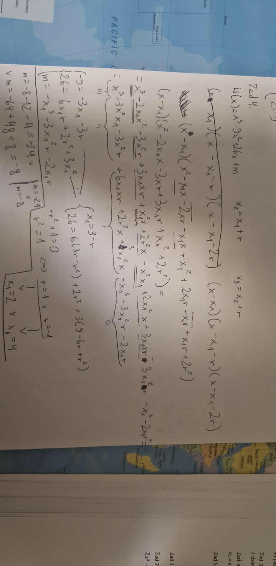 Dla jakiej wartości parametru "m" pierwiastki W(x) = x³ - 9x² +26x +m spełniają warunki: x2 = x1 + r i x3=x2 +r? Oblicz pierwiastki tego wielomianu. Rozwiąż nierówność W(x² + 3) > lub = 0