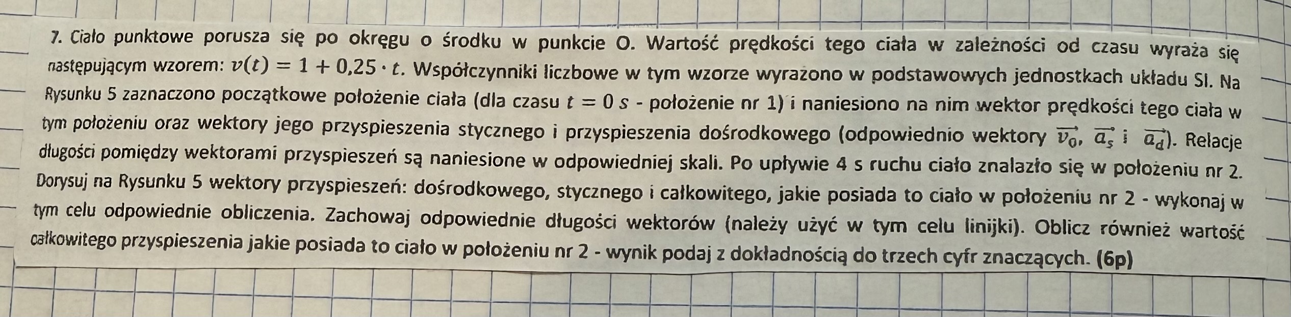 Promień nie jest nam potrzebny - zauważmy bowiem, że w położeniu nr 1 wektory przyspieszenia stycznego i dośrodkowego mają te same długości - wartości tych przyspieszeń są zatem takie same i wynoszą 0,25 m/s^2. A zatem w położeniu nr 2 skoro wektor przyspieszenia dośrodkowego zwiększył swoją wartość czterokrotnie, to teraz jego wartość jest równa 1,00 m/s^2.