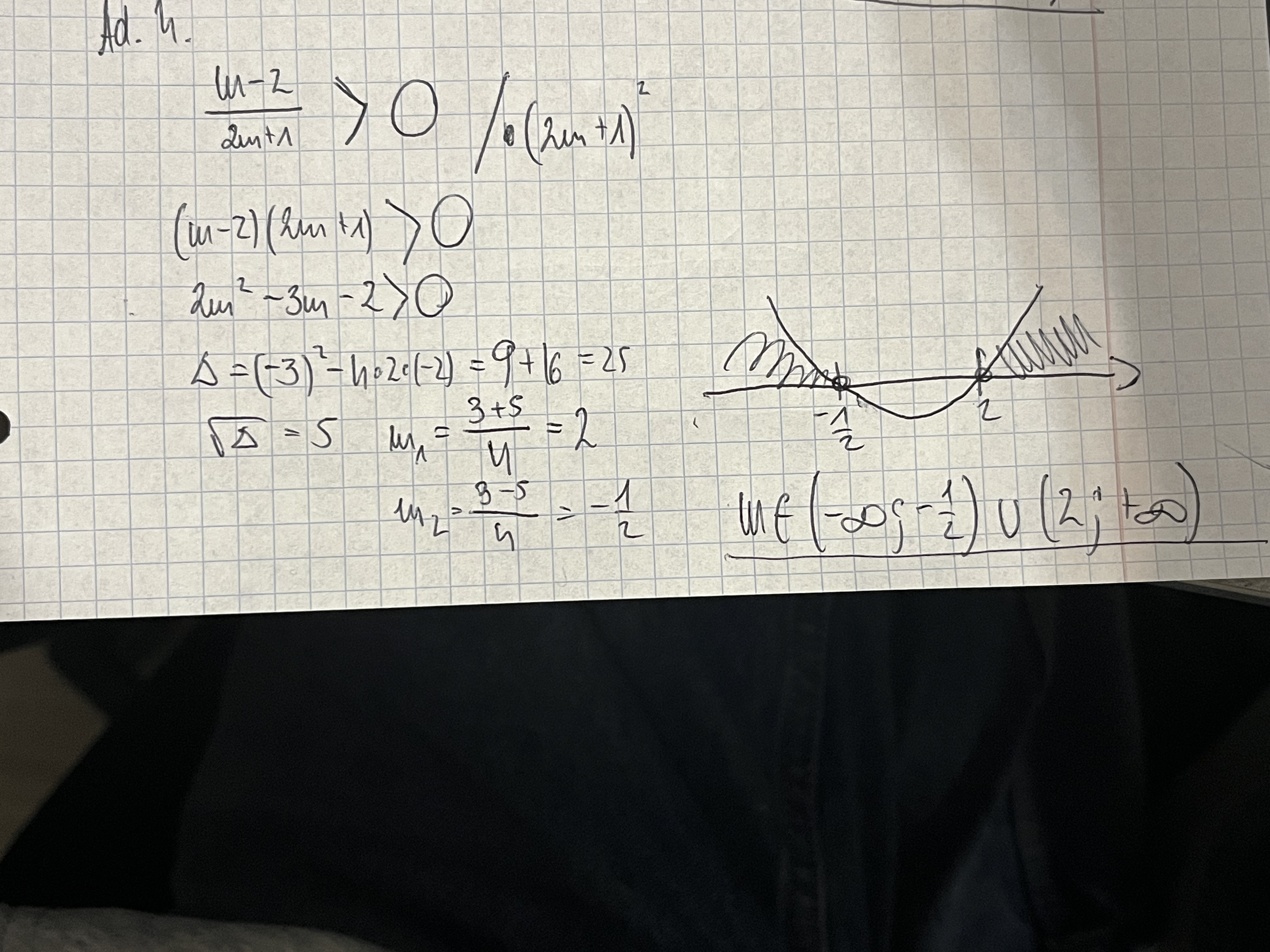 Hejka, ja ten warunek to zapisałam jako x1*x2<0, i widziałam, że w kluczu jest x1*x2>0 ale nie rozumiem dlaczego, bo jedno miejsce zerowe to x=-3, a jak mamy spełnić warunek x1*x2*x3 >0 to mając już jedną liczbę ujemną to te dwie pozostałe powinny być jedna dodatnia druga ujemna, bo iloczyn dwóch liczb ujemnych daje dodatnią liczbę, razy liczba dodatnia jest to na pewno >0. i jak zapisze sie taki warunek na x1*x2<0 to rozwiązaniem jest faktycznie (-1/2 ; 2) czyli tak jak w kluczu. Zastanawiam się czy w książce zdarzyła się pomyłka z tym zwrotem, czy ja nie coś źle rozumiem.
