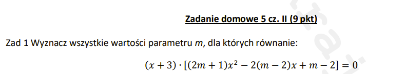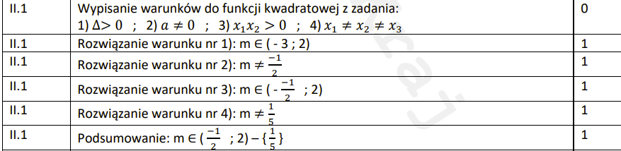 2) Czy zwrot x1*x2 jest poprawy w książce? Ja ten warunek zapisałam jako x1*x2<0, a w kluczu jest x1*x2>0 ale nie rozumiem dlaczego, skoro jedno miejsce zerowe to x=-3, a jak mamy spełnić warunek x1*x2*x3 >0 to mając już jedną liczbę ujemną to te dwie pozostałe powinny być jedna dodatnia druga ujemna, bo iloczyn dwóch liczb ujemnych daje dodatnią liczbę, razy liczba dodatnia jest to na pewno >0. i jak zapisze się taki warunek na x1*x2<0 to rozwiązaniem jest faktycznie (-1/2 ; 2) czyli tak jak w kluczu. Zastanawiam się czy w książce zdarzyła się pomyłka z tym zwrotem, czy ja nie coś źle rozumiem.