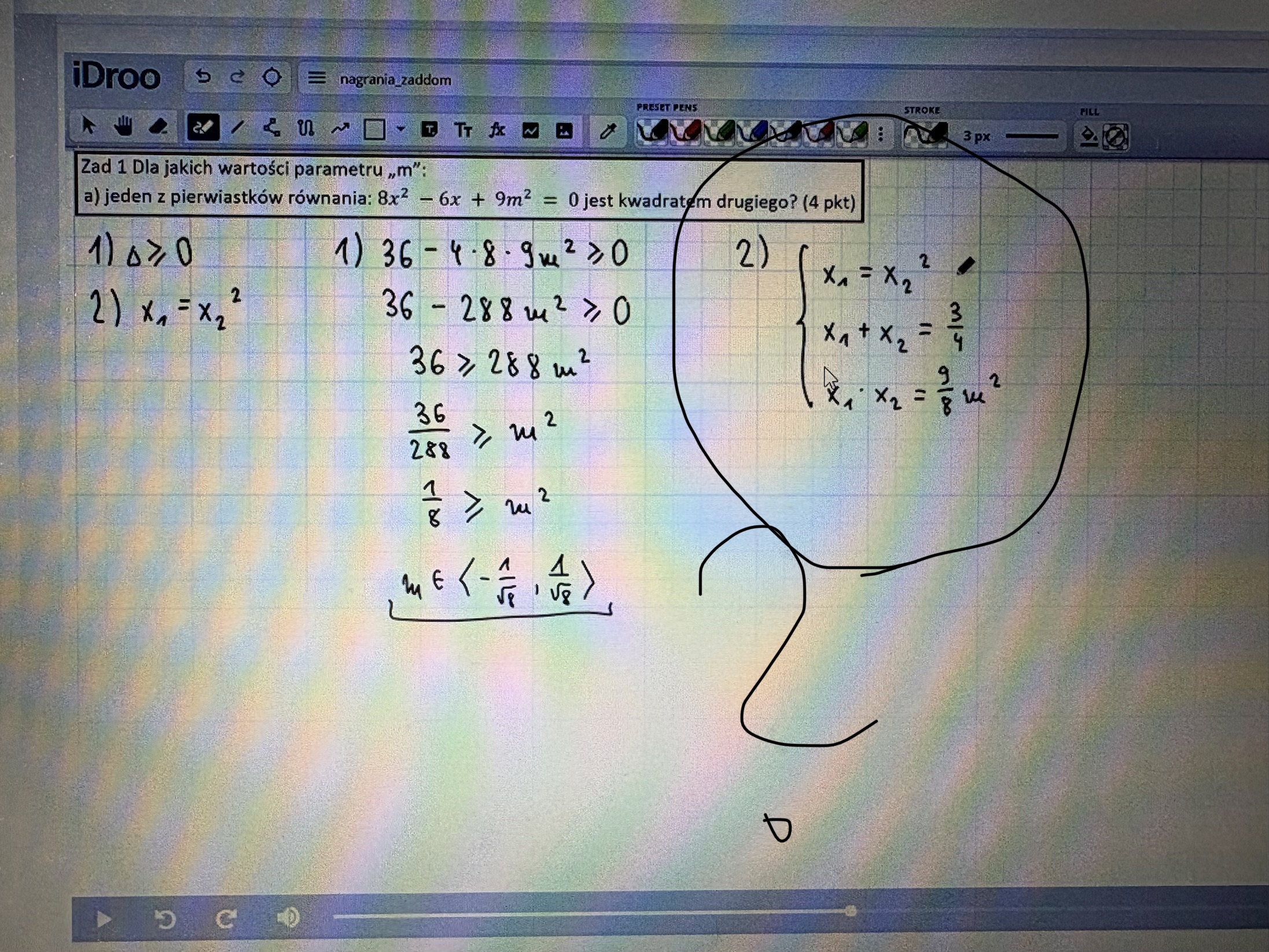 Hej, pierwszy warunek wynika z treści zadania ze jeden pierwiastek ma być kwadratem drugiego. Drugi wynika z wzorów Viete’a czyli x1+x2= -b/a, b=-6 a=8 więc -b/a= 3/4. Trzeci warunek to też wzory Viete’a czyli x1•x2=c/a, c=9m^2 a=8, stąd te wzory, a są one nam potrzebne żeby móc wyliczyć warunek 2)