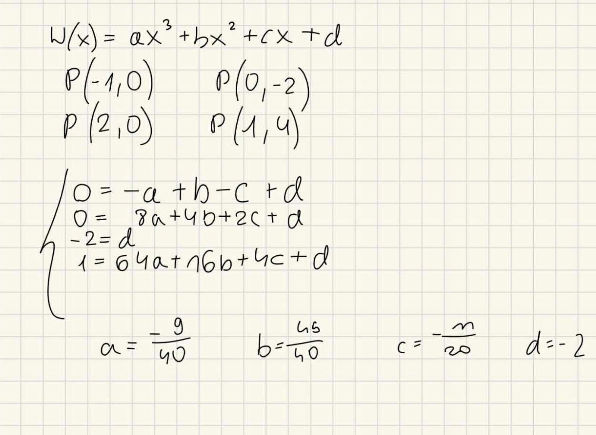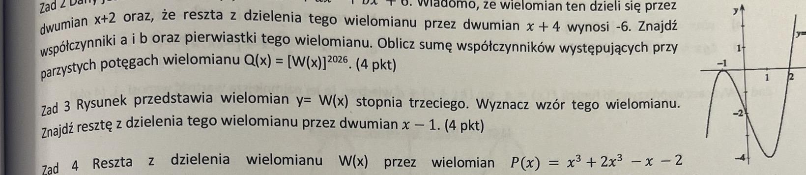 Hejka, powinnaś to zrobić w taki sposób że z wykresu znajdujesz miejsca zerowe czyli -1 i 2 i zapodajesz równania ze W(-1)=0 i W(-2)=0, zauważ też że miejsce przecięcia funkcji z osią OY to wartość funkcji dla x=0, czyli W(0)=-2. Jak znasz już miejsca zerowe to wzór wielomianu powinnaś zapisać jako W(x)=a(x+1)^2(x-2) i do tego wzoru podstawiać te punkty i wtedy powinny ci wyjść współczynniki