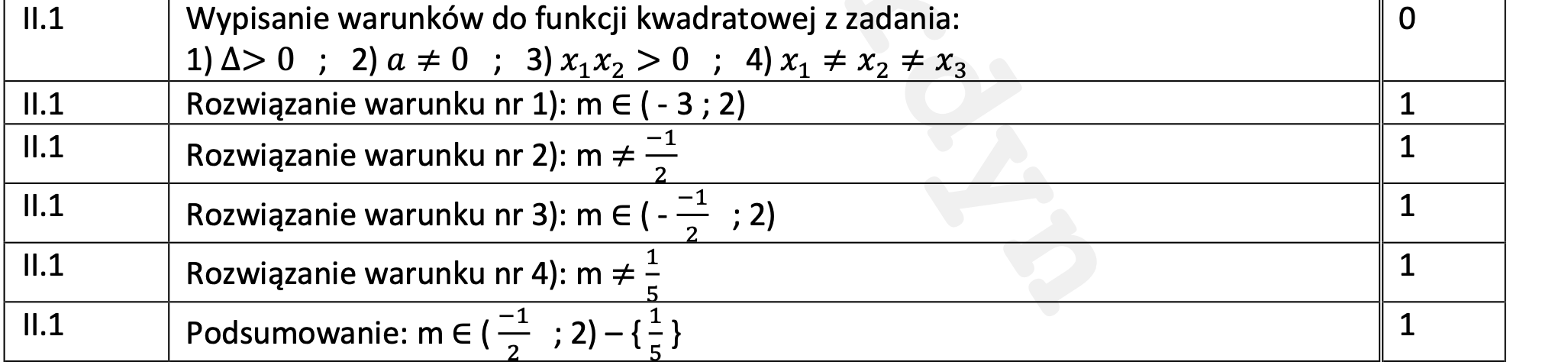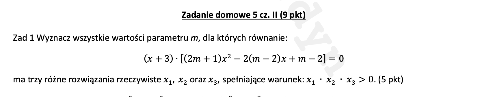 Hejo, nie rozumiem warunków w tym zadaniu. Dlaczego x1*x2>0? skoro jedno x już mamy i wynosi -3, a w zadaniu jest napisane, ze mają być 3 różne rozwiązania spełniające warunek x1*x2*x3>0. Mamy już jedną ujemną liczbę, żeby x1*x2*x3 było większe od zera to liczba pierwiastków ujemnych ma być parzysta. Węc skoro mamy już jedną ujemną liczbę i teraz obliczamy wyrażenie kwadratowe, to w nim musi być tylko jeden ujemny pierwiastek. Jeśli nie będzie żadnego to x1(ujemny)*x2(dodatni)*x3(dodatni)dadzą wynik mniejszy od zera. Podobnie, gdy obydwa pierwiastki będą ujemne, wtedy trzy pierwiastki, które są ujemne dadzą ujemy wynik. Czemu nie ma warunku x1*x2<0, tylko jest >0?