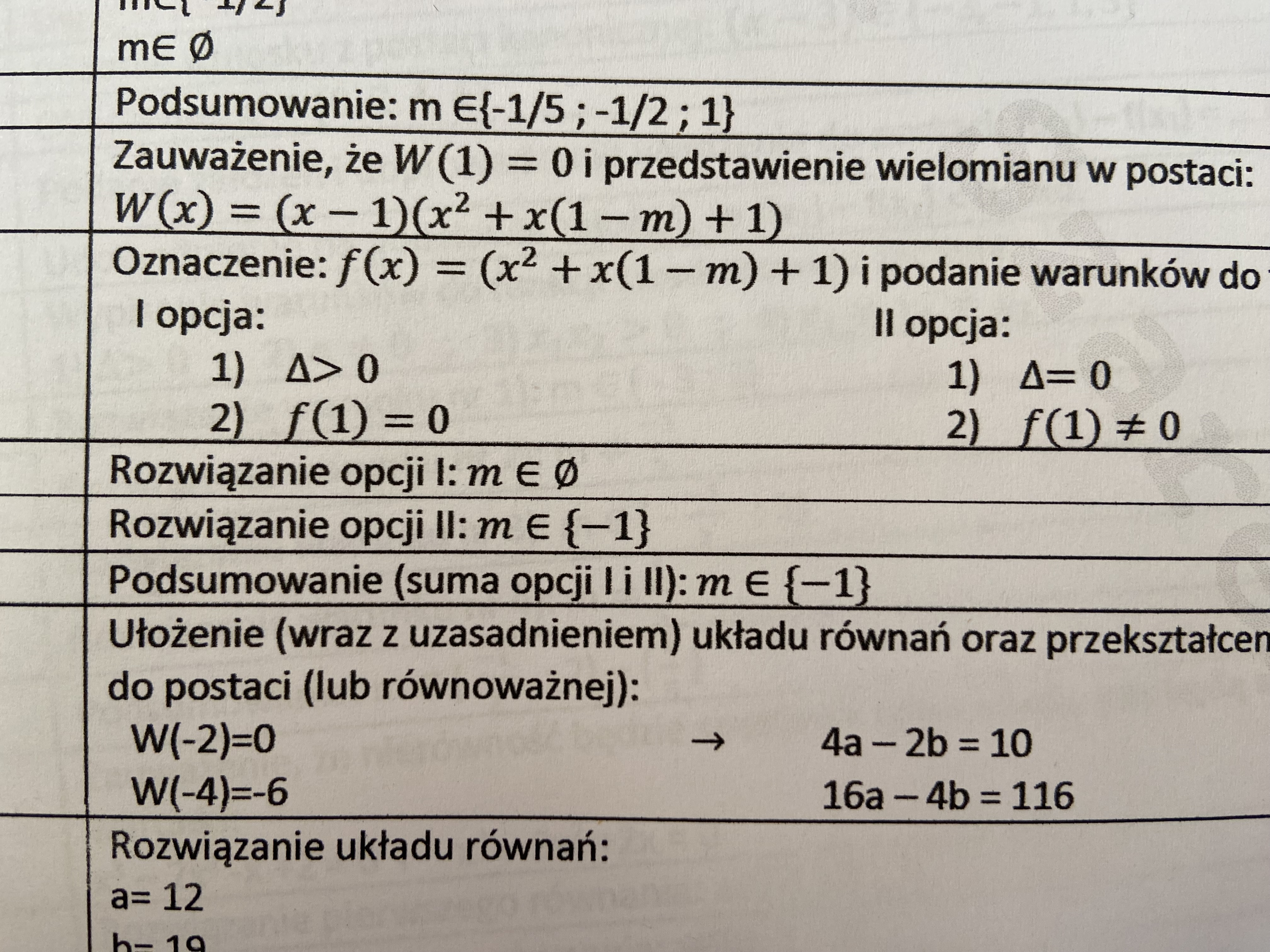Jeśli dobrze rozumiem to mają być dwa różne pierwiastki , jeden już mamy i wynosi z dzielenia hornerem że to 1 , zaś jeśli damy do równania kwadratowego deltę to jeśli rozważamy przypadek dla dwóch miejsc zerowych i wychodzą one jak policzyłaś -1 i 3 to wychodzi nam że me(-00,-1) u(3,+oo) i koniunkcja z przypadkiem f(1)=0 to z tego wychodzi nam m=3 a więc koniukcją będzie zbiór pusty