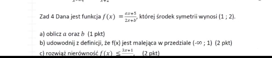 Generalnie jeżeli prawidłowo sprowadziłaś to postaci a:(x-p) + q to q powinno ci wyjść 0.5 a teraz wiemy że środek symetrii to punkt (1,2) czyli asymptota pozioma jest równa 2, czyli q=2 skoro u nas q=0.5 a to 2=0.5a, mnożysz razy 2 i wychodzi ci że a =4. Otwórz zdjęcie
