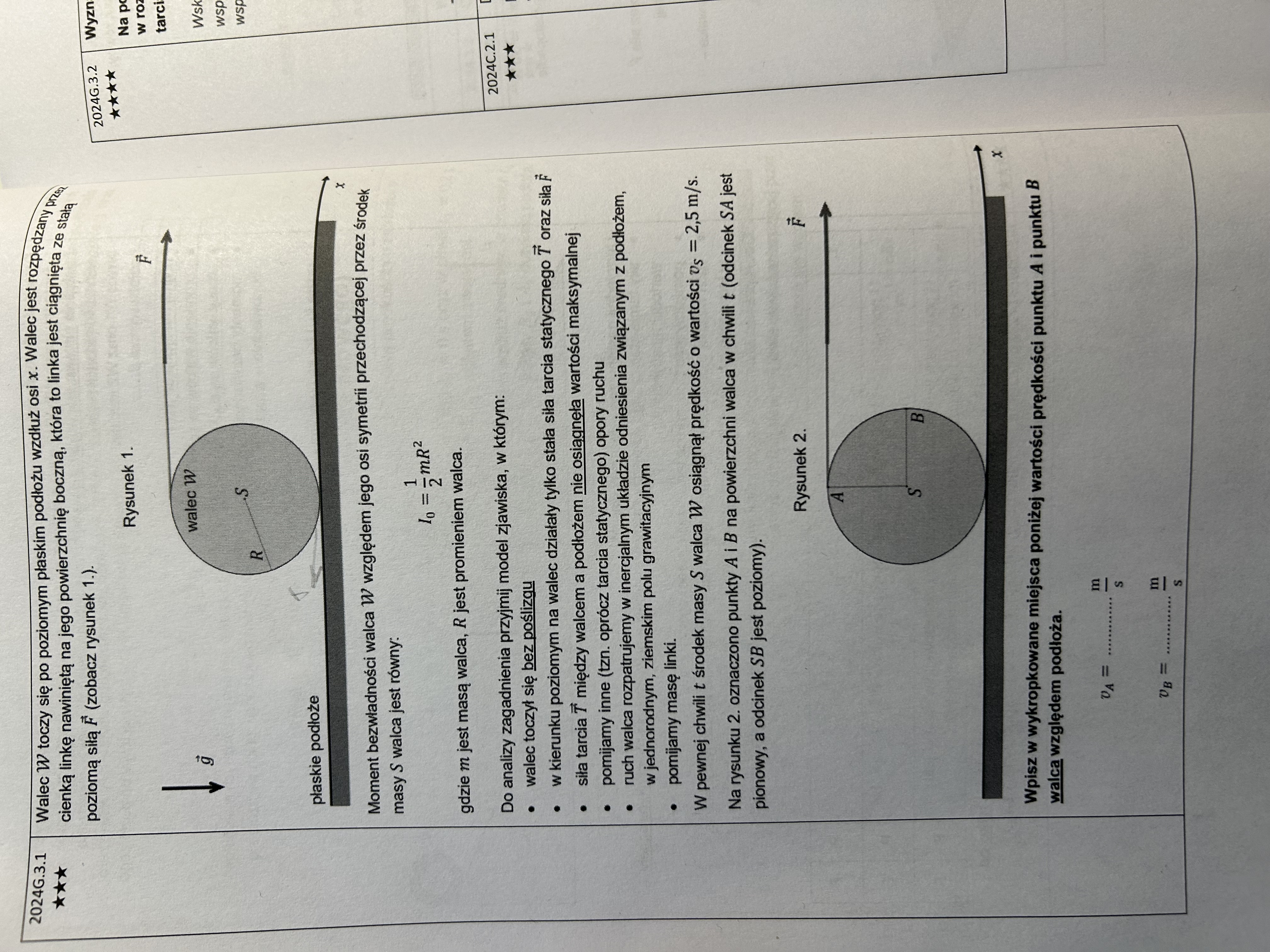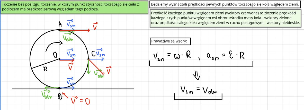 Należy to zrobić dokładnie tak, jak robiliśmy to na zajęciach nr 6, gdy mówiliśmy o prędkościach różnych punktów bryły sztywnej (która toczy się bez poślizgu) względem podłoża. Poniżej zamieszczam screen z tego momentu naszych zajęć: