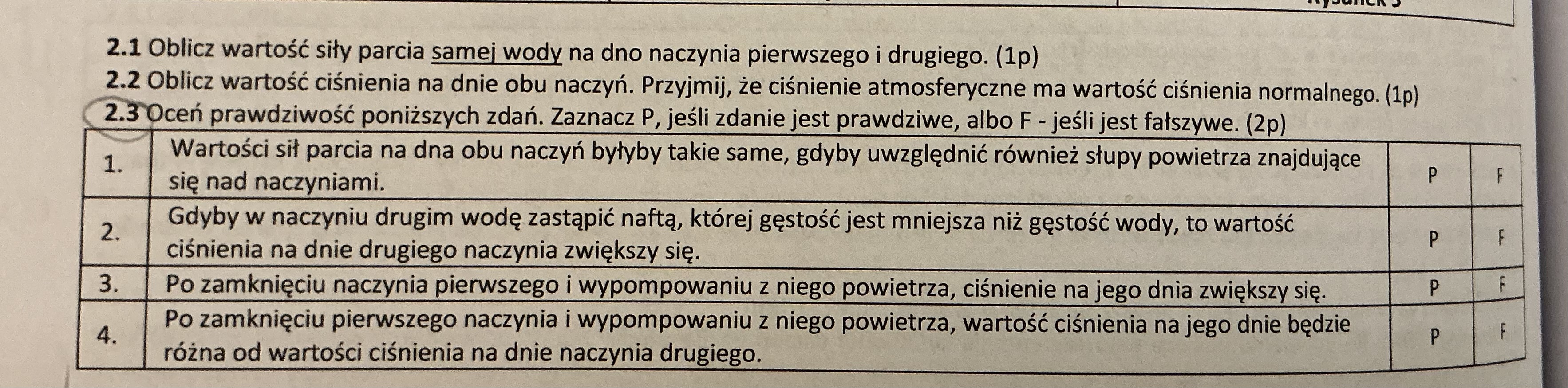 To zdanie nr 1 można w sumie na dwa różne sposoby zinterpretować i to jest jego delikatny minus - natomiast autorowi chodziło o to, czy gdy jednak uwzględnimy ciśnienia atmosferyczne, to dalej siły parcia działające na dna naczyń będą jednakowe w sensie tego, że w naczyniu nr 1 i naczyniu nr 2 będą takie same. I to jest prawda, bo to dodane w obu przypadkach pat jest takie samo, więc ono się wzajemnie "wycina". A to, że to jest nazwane "słupem powietrza" to nic, chodzi w istocie o to dodanie pat po obu stronach - nie zmienia to faktu, że zdanie to jest prawdziwe.