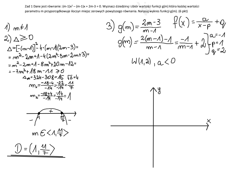 Dane jest równanie: (m-1)x2 – (m-1)x + 2m-3 = 0. Wyznacz dziedzinę i zbiór wartości funkcji g(m) która każdej wartości