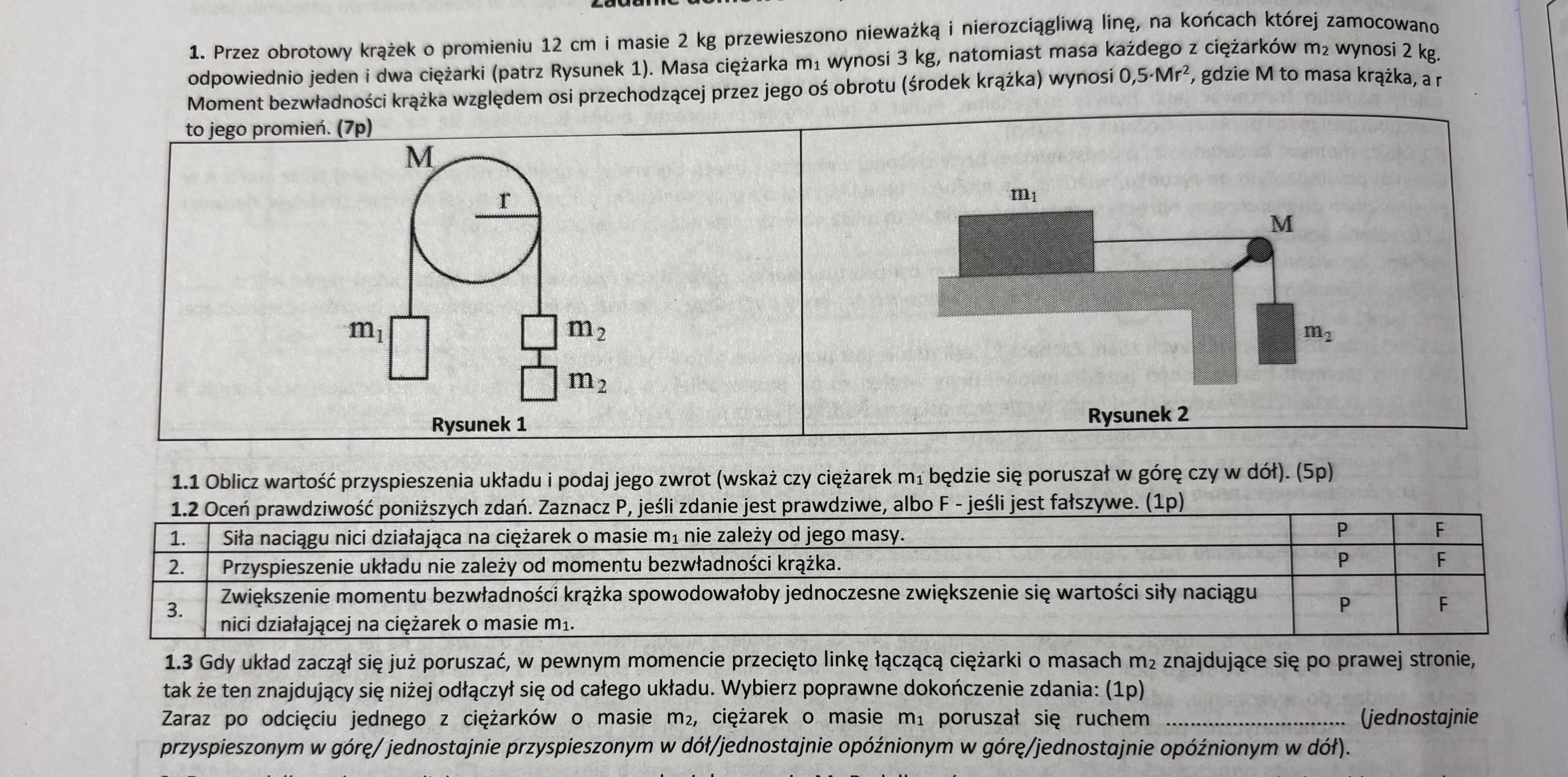 W zasadzie dobrze rozumujesz, ale wysnuwasz z tego zły wniosek, bądź po prostu używasz niepoprawnego nazewnictwa. Mianowicie po odcięciu jednego ciężarka m2, ten drugi ciężarek m2 po prawej stronie faktycznie dalej porusza się w dół, ale samo przyspieszenie tego ciężarka m2 będzie już zwrócone w górę (bo teraz już ten ciężarek m1 po lewej "przeważa" i przyspieszenie układu zmienia zwrot). Czyli ruch ciężarka m2 to będzie ruch zwrócony w dół, ale już opóźniony. I po pewnym czasie prędkość w wyniku tego ruchu opóźnionego się wyzeruje, a następnie układ zacznie poruszać się w przeciwną stronę. No ale tuż po odcięciu jednego ciężarka m2 ruch tego drugiego ciężarka będzie zatem ruchem w dół, ale opóźnionym.