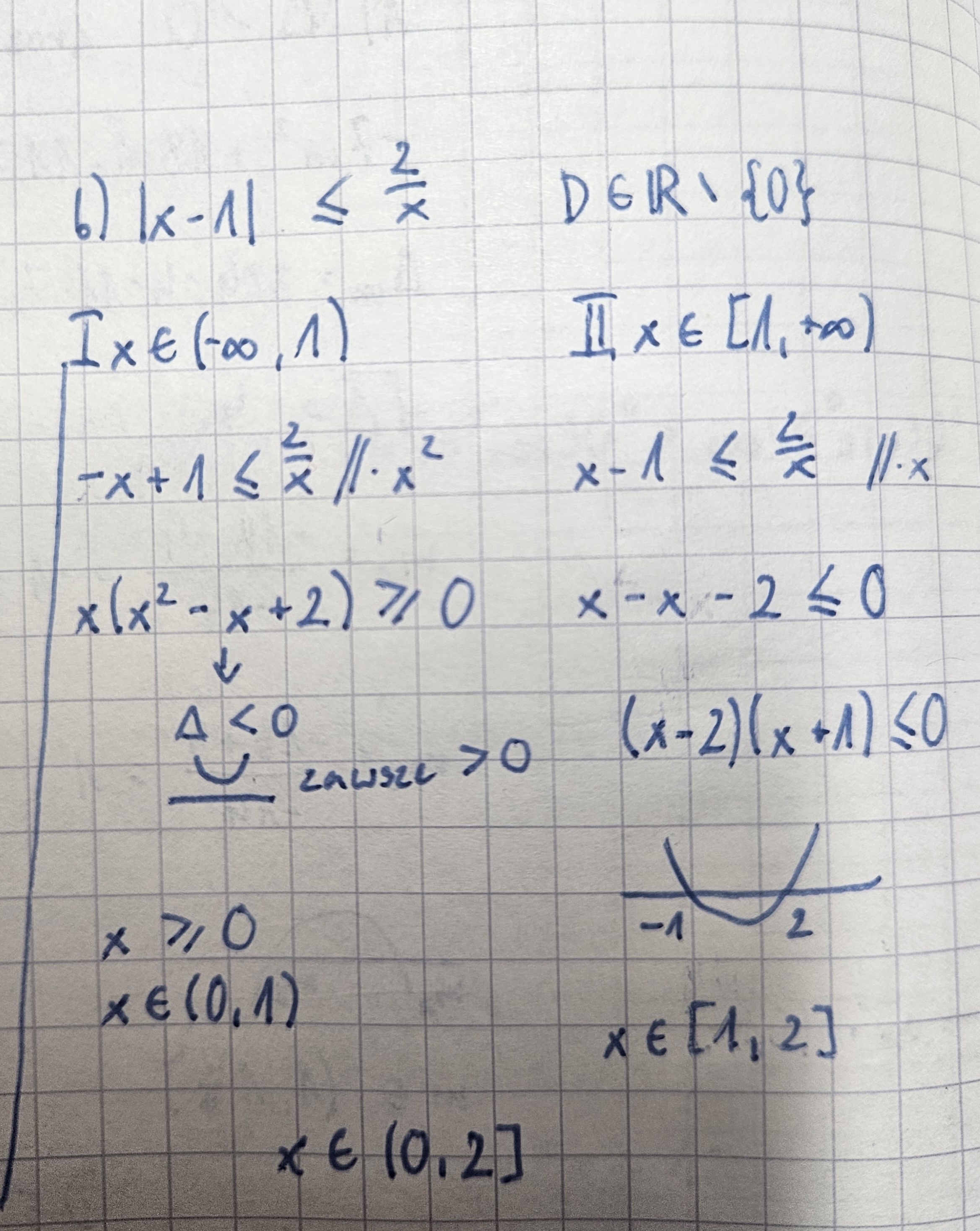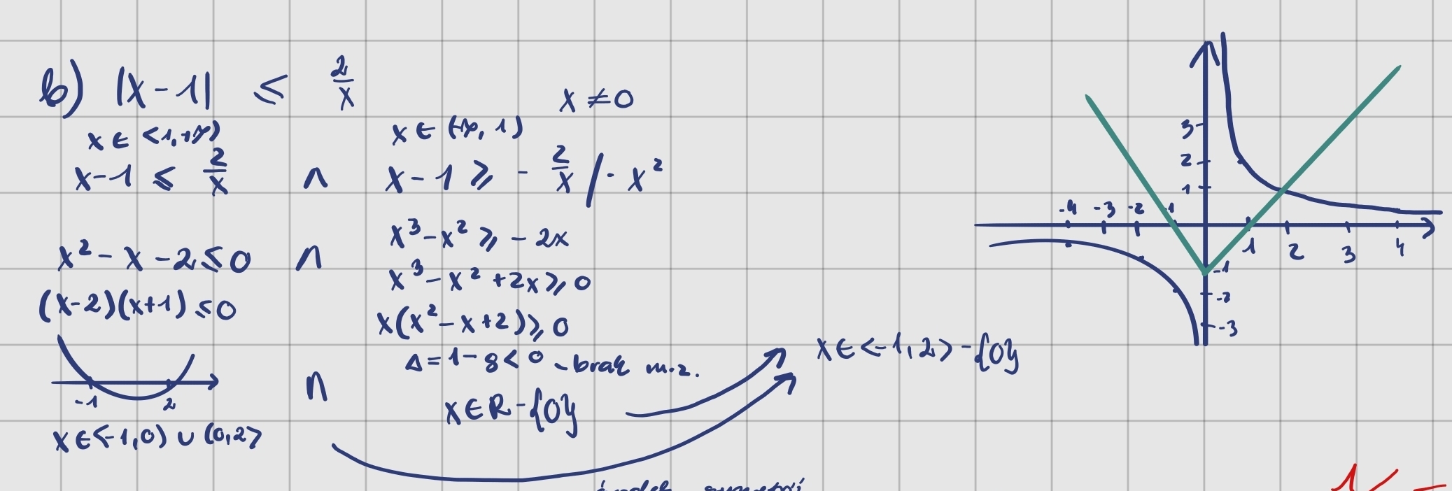 Sprawdzałam to zadanie zgodnie z kryteriami i dobrze wyliczam nierówność w przedziale <1, + nieskończoność) i wychodzi mi x należy do <-1,2> - {0}, ale gdzieś się mylę w przedziale (- nieskończoność, 1) bo wychodzi mi, że x należy do R- {0}. Nie wiem czego to kwestia a rozwiązania na pewno dobre, bo jak się rozrysuje funkcje to widać, że przedział (0,2> jest rozwiązaniem a mi wychodzi <-1,2> - {0}