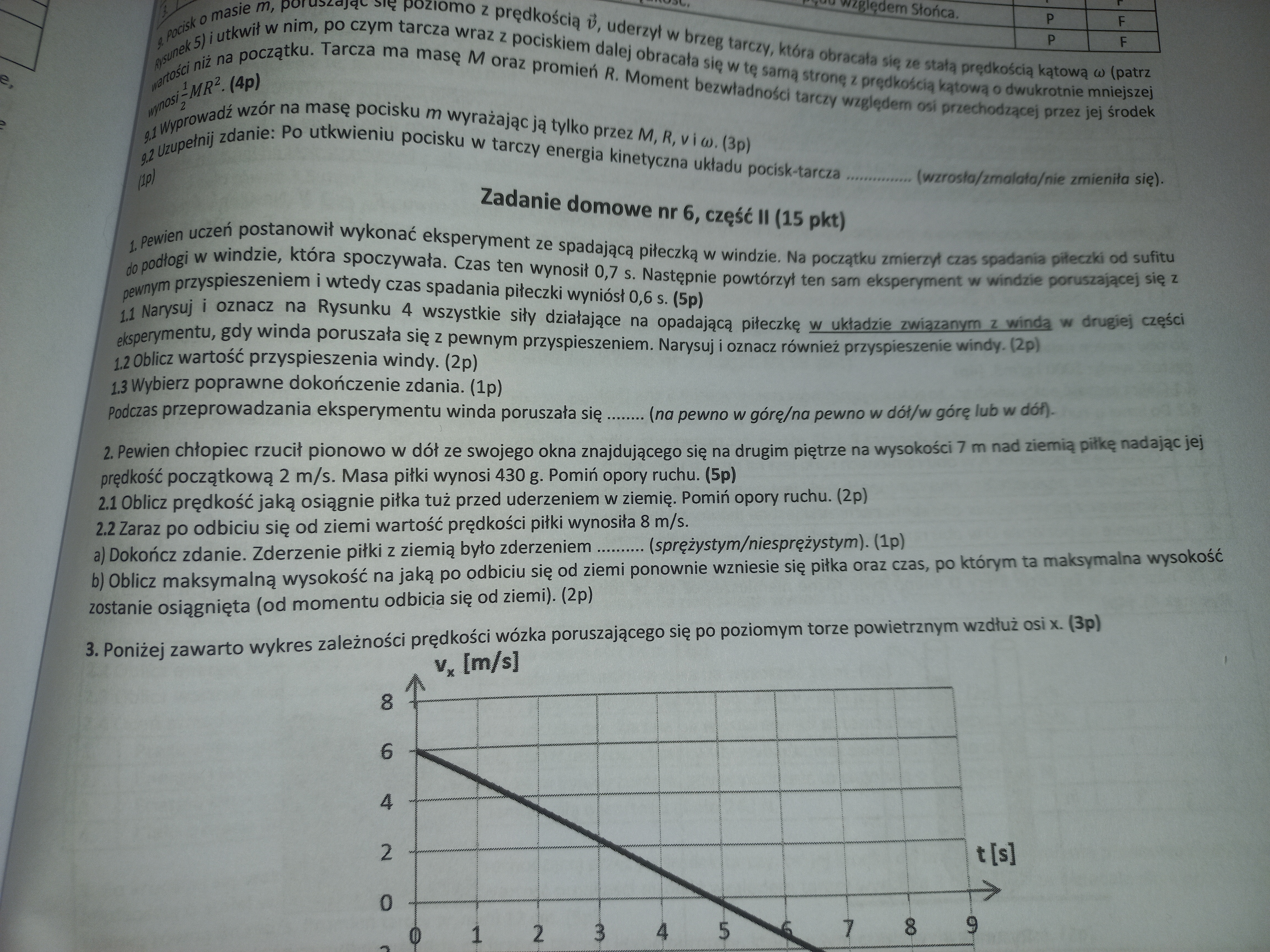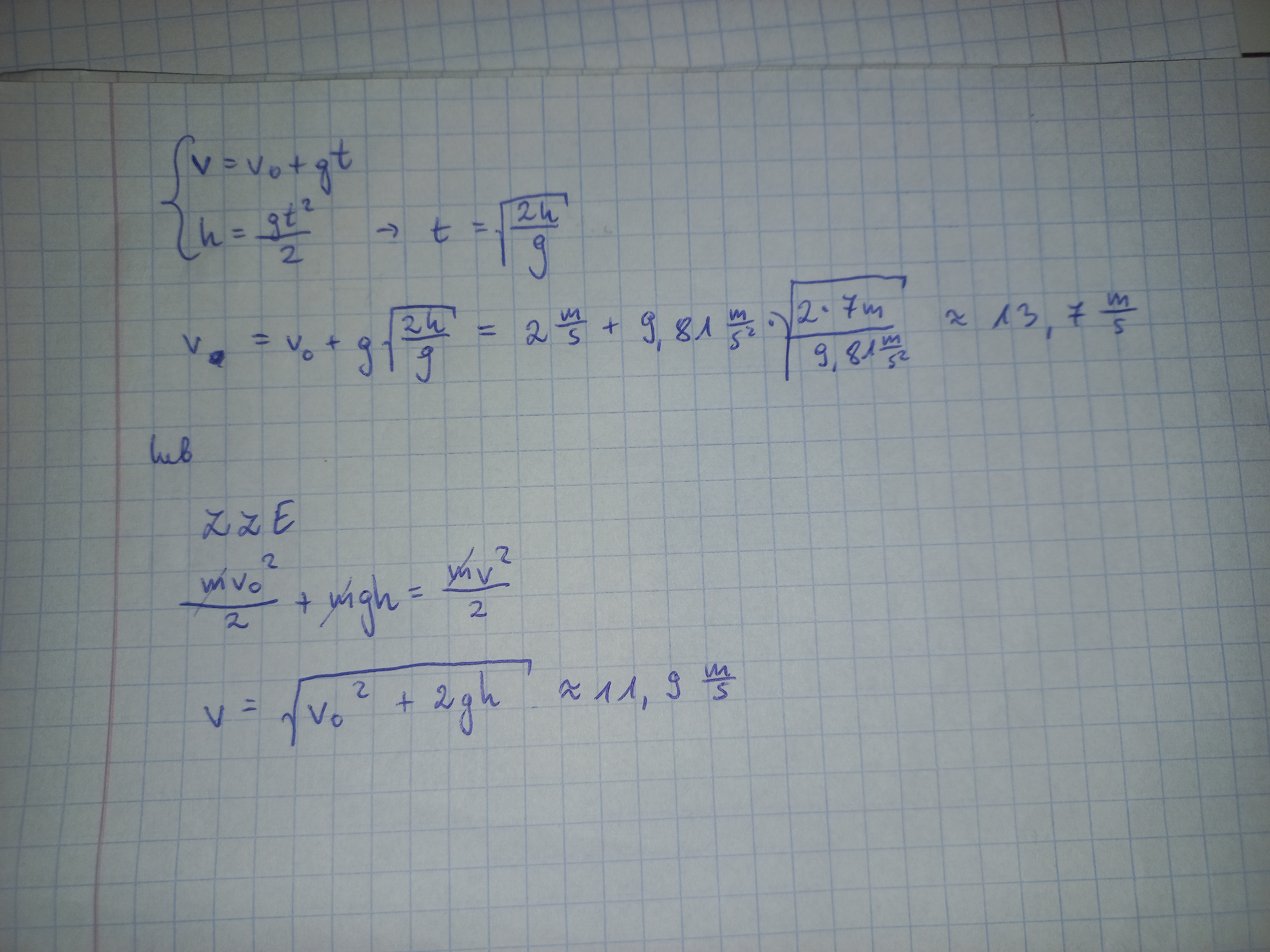 Można użyć tu wzorów kinematycznych, natomiast Ty błędnie zapisałaś równanie na przebytą drogę - mamy tutaj bowiem niezerową prędkość początkową (co słusznie zauważyłaś zapisując zresztą wzór na prędkość), więc drogę policzymy ze wzoru: h = v0*t + gt^2/2. Jeśli użyjesz takiego wzoru na drogę w tym układzie równań i rozwiążesz go, to wyjdzie Ci taka sama odpowiedź jak w przypadku użycia ZZE.