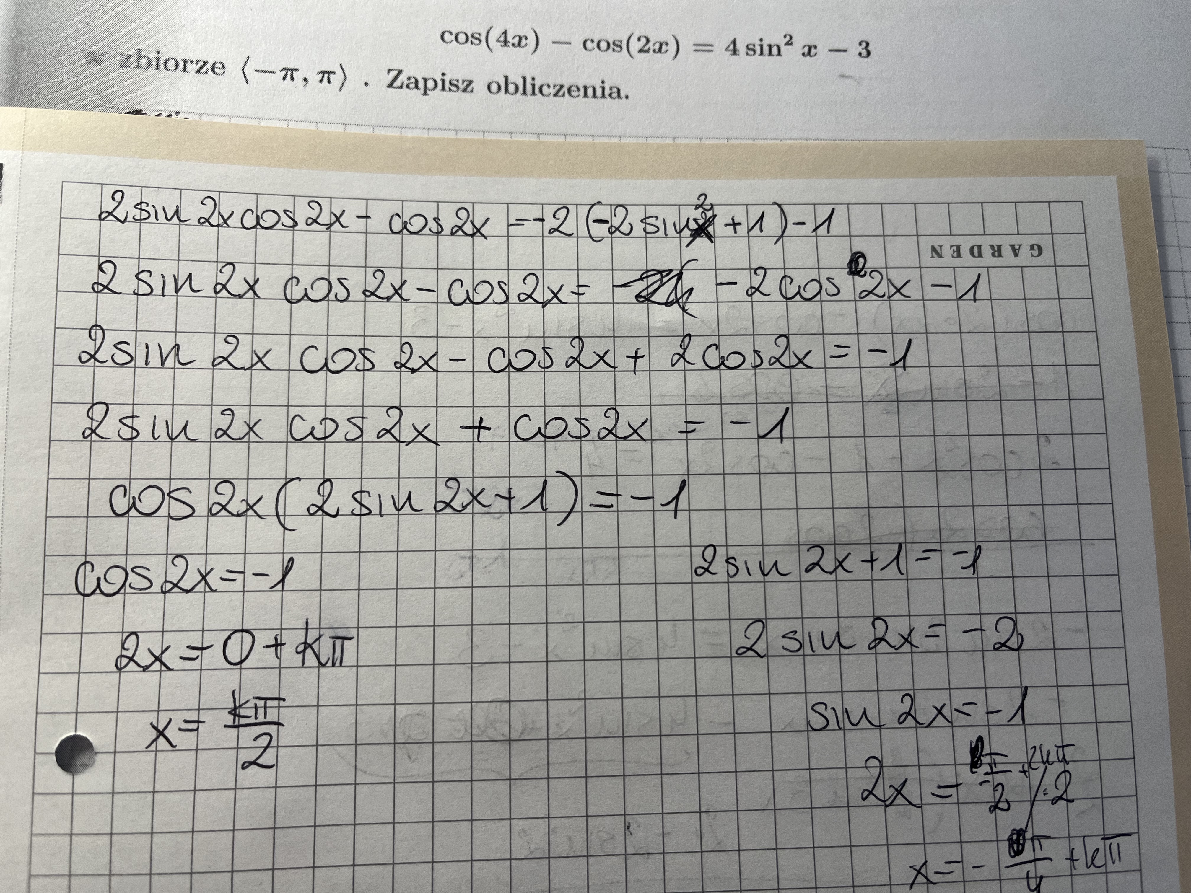 Po lewej stronie korzystasz ze wzoru na sin2x a masz tam cos więc nie jest to poprawne. Zamiast tego skorzystaj z wzoru cos2x= 2cos²x - 1