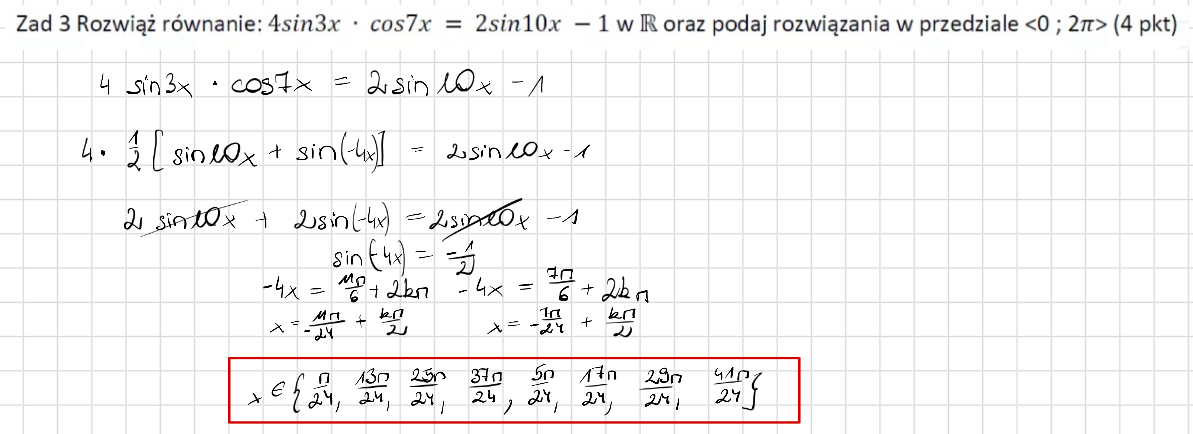 Sinus jest funkcja nieparzysta wiec możesz wyciągnąć minus i będzie sin4x= ½. Odpowiedzi wyjdą Ci takie same, to tylko taki mały szczegół
