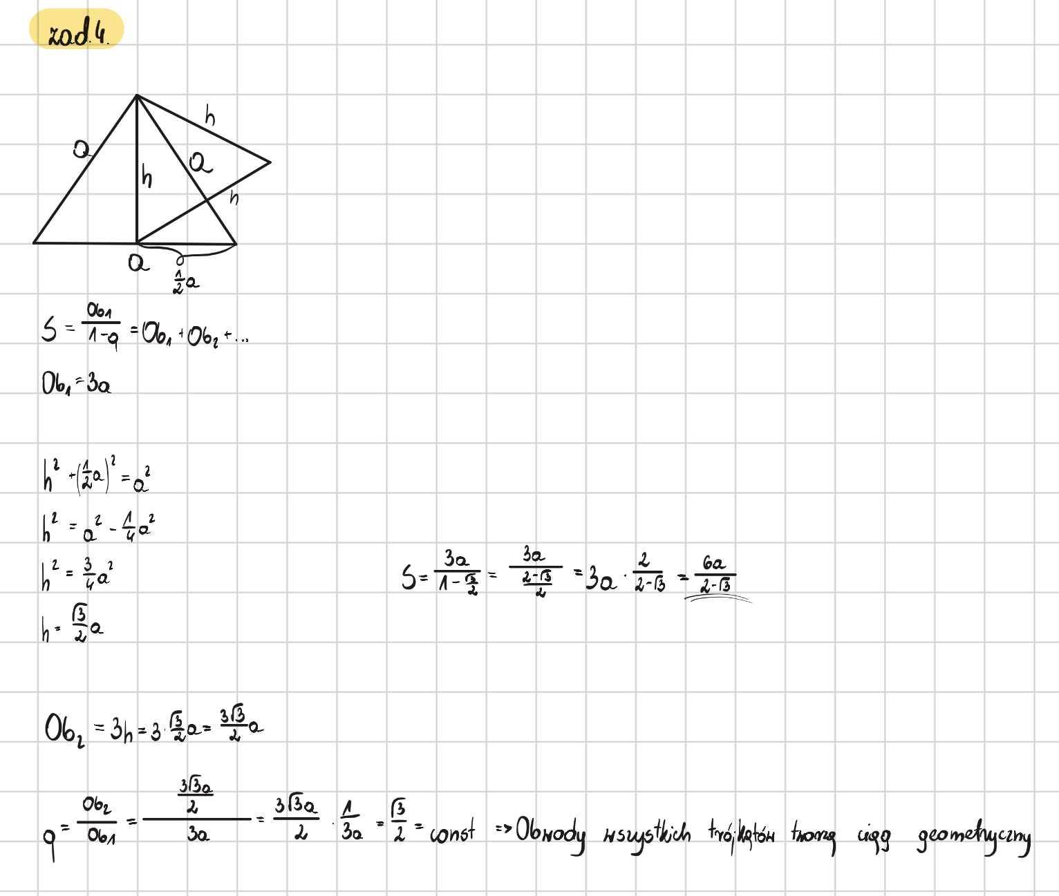 Brakuje napisania, że IqI<1 plus pisząc, że obwody wszystkich trójkątów tworzą ciag geometryczny jest to troche niejednoznaczne bo jeśli chodzi Ci o ich sumę to tworzą szereg, jesli o kojejne obwody to faktycznie ciąg. Ogólne sposób rozwiazanie jest okej, jedynie niepotrzebnie wyliczasz z pitagorasa h, wzór na wysokość trójkąta równobocznego jest w kartach