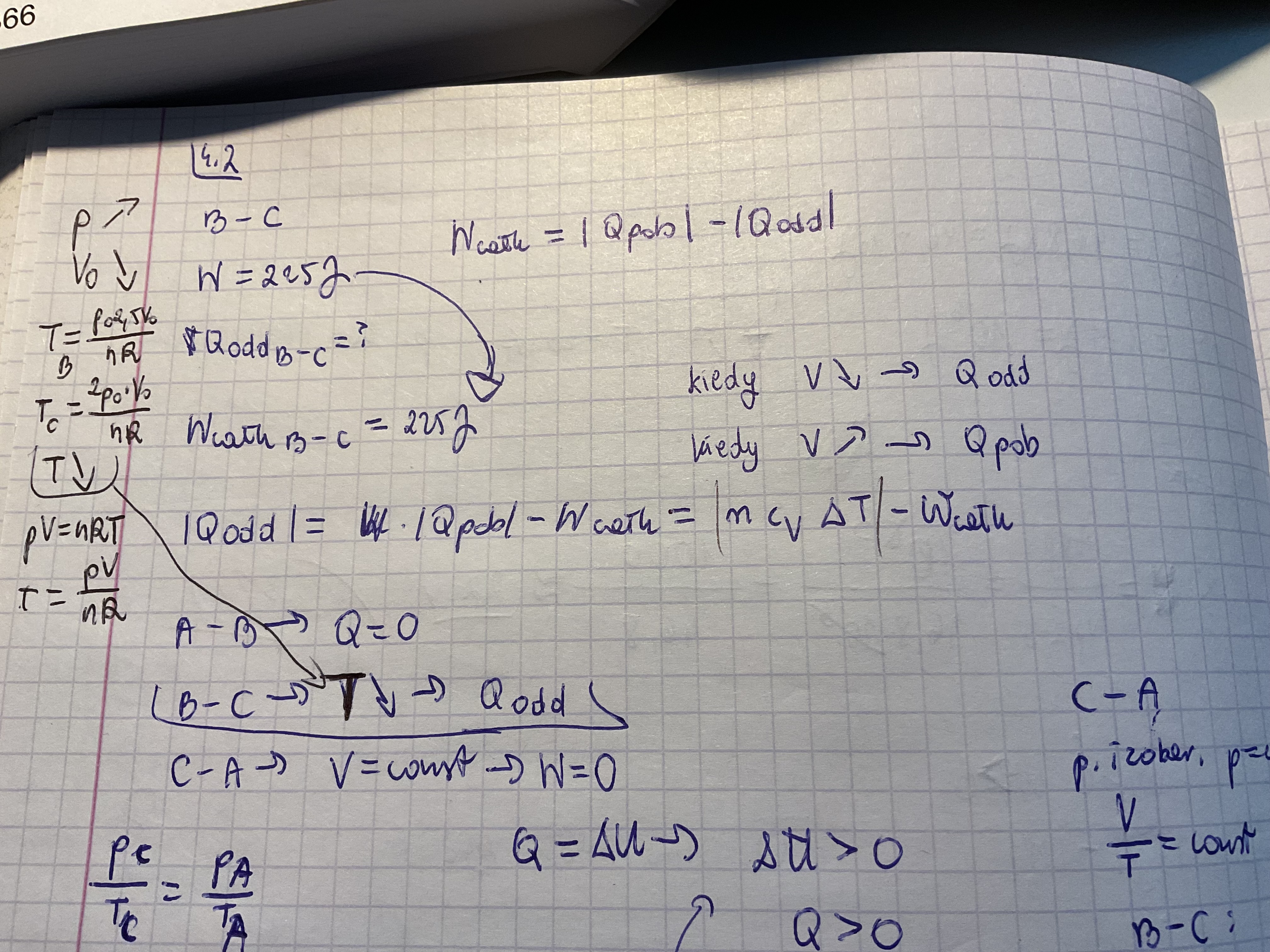 Troszkę pomyliłaś użycie wzorów - wzór, który zapisałaś na Wcałk jest ok, natomiast on dotyczy całego cyklu (czyli niejako wszystkich przemian naraz). A my w tym podpunkcie mamy do czynienia po prostu z jedną przemianą B-C. I w takiej sytuacji najlepsze jest użycie po prostu I zasady termodynamiki, z której wiemy, że deltaU = Q + W, więc Q = deltaU - W. Ostatecznie daje to zatem w zasadzie podobny wzór do tego, który otrzymałaś, natomiast teraz będzie to wynikało już z prawidłowych przesłanek. I zauważ, że w takiej sytuacji, ponieważ korzystamy właśnie z I zasady termodynamiki, a nie z tego równania dla cyklu, to nie pojawiają się tam już żadne wartości bezwzględne, stąd nie ma ich np. w zapisie w roziwązaniu/kryteriach.