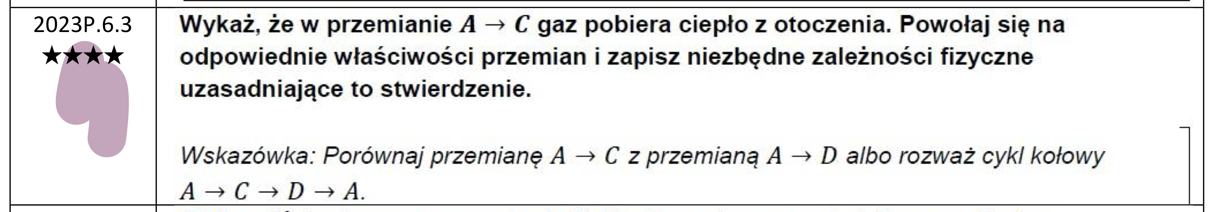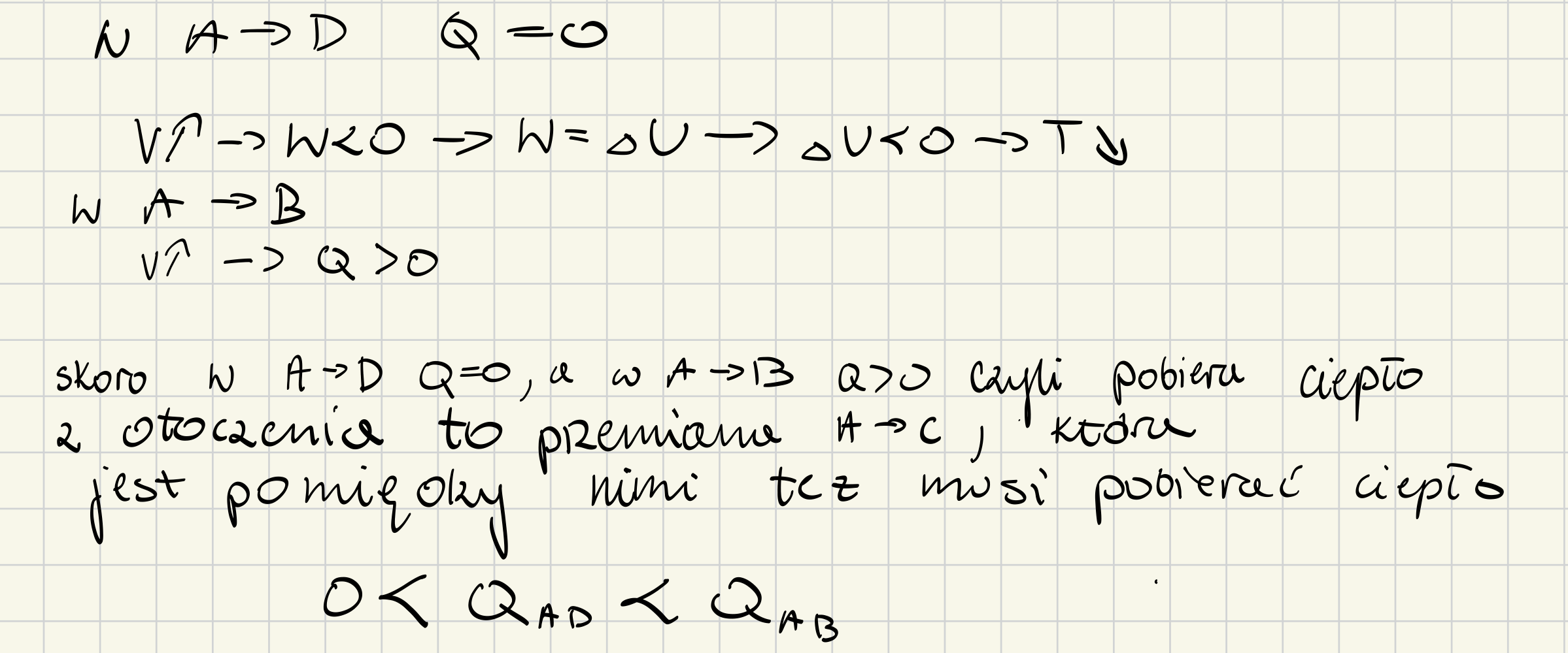 Rozumowanie jest ok, natomiast pojawia się pytanie, czy to, że przemiana AC leży "pomiędzy" przemianami AB i AD jednoznacznie oznacza również to, że ciepło wymieniane przez gaz w przemianie AC jest "pomiędzy" wartościami ciepeł wymienianych przez gaz w przemianach AB i AD? Jak dla mnie (i być może dla CKE również) nie jest to wystarczające, choć jeśli w jakiś sposób wykazałabyś albo przynajmniej zapisała, że faktycznie każda przemiana, która w tym przypadku wychodziłaby z punktu A i kończyła się na prostej pionowej przechodzącej przez 5V1 w punkcie znajdującym się powyżej punktu D jest przemianą, w której gaz musi pobierać ciepło (a tak w istocie jest), to myślę, że wtedy istnieje bardzo duża szansa, że zostałoby to uznane.