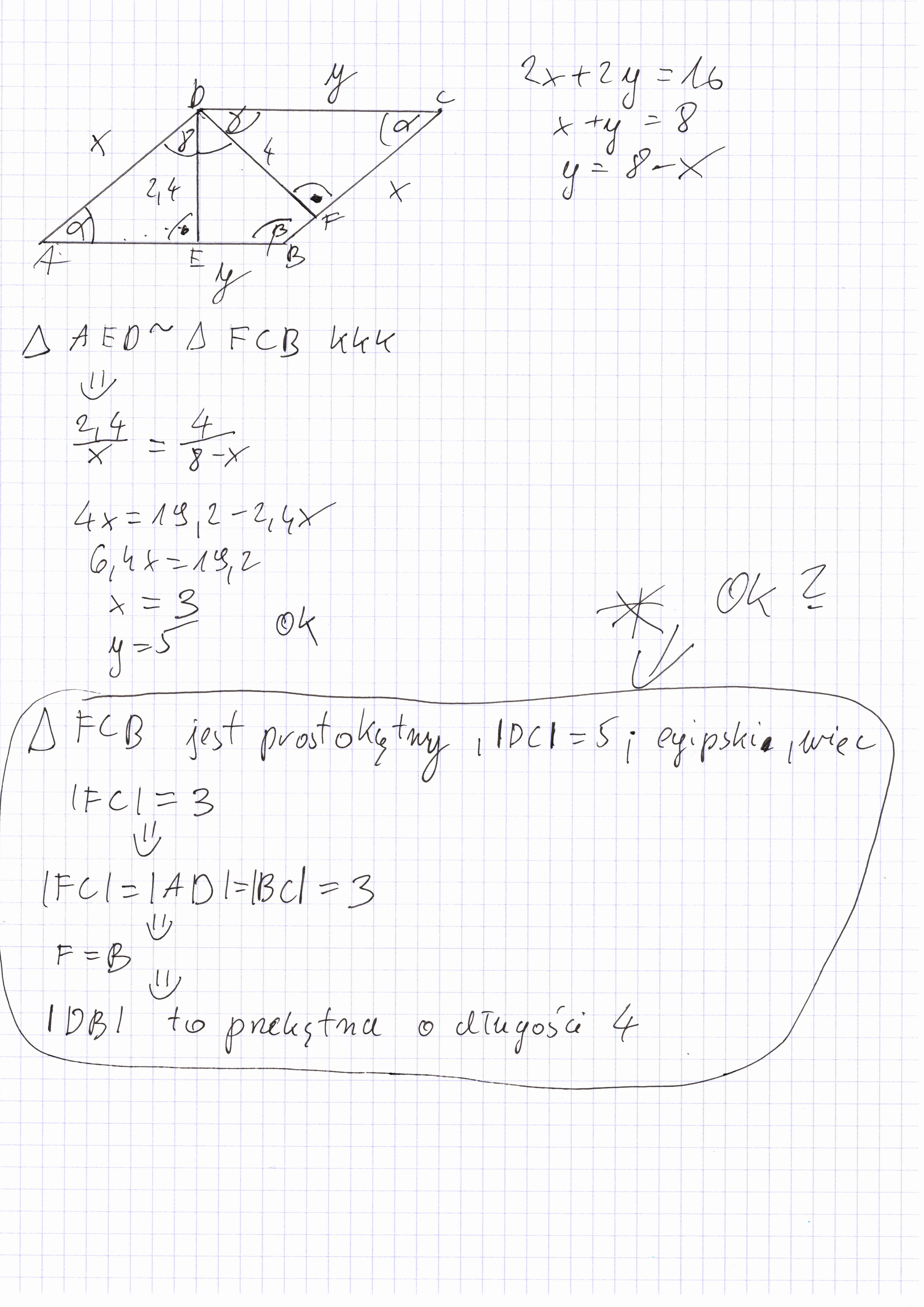 Pisałam o czworokątach a nie trójkątach, ale faktycznie jest taka możliwość mój błąd. Tylko ty piszesz o trójkątach z kkk i zamiast trójkąt FCD piszesz FCB, a potem nie wiem skąd masz, że trójkąt FCB jest prostokątny, mimo że te punkty sa na jednej prostej.