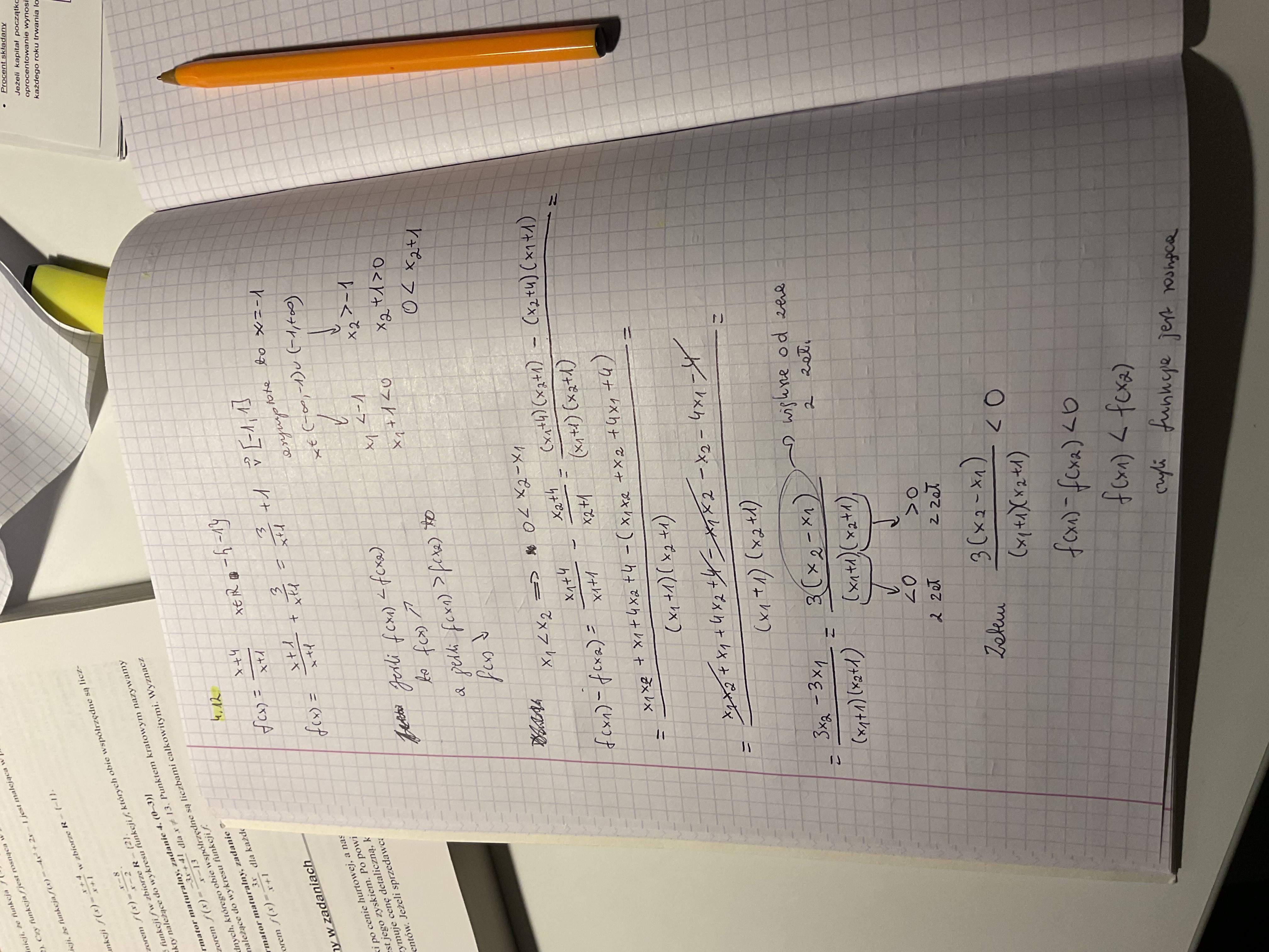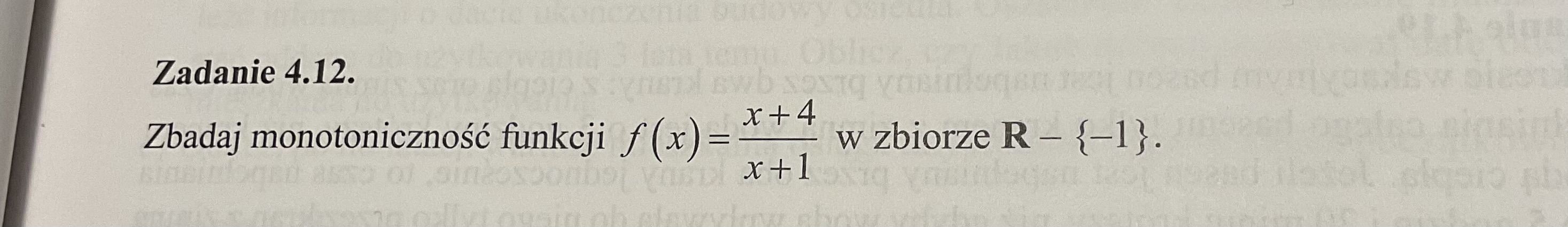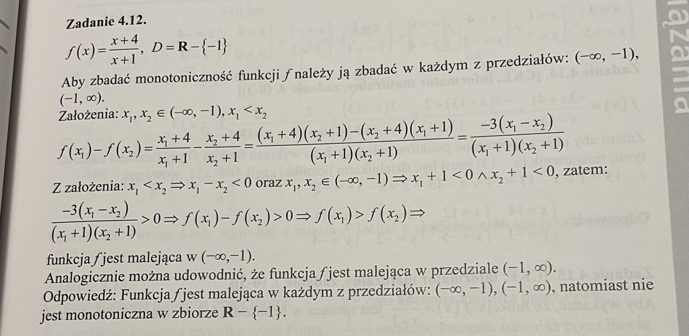 W odpowiedzi jest że funkcja jest malejąca osobno w przedziale (-oo, -1) i osobno w (-1, oo) a że w (-oo, -1)u(-1,oo) jest niemonotoniczna ale jest duże prawdopodobieństwo że to błąd bo ta książka to pierwsze wydanie i co chwilę znajduję jakieś błędy, więc zastanawiam się czy zrobiłam to dobrze.