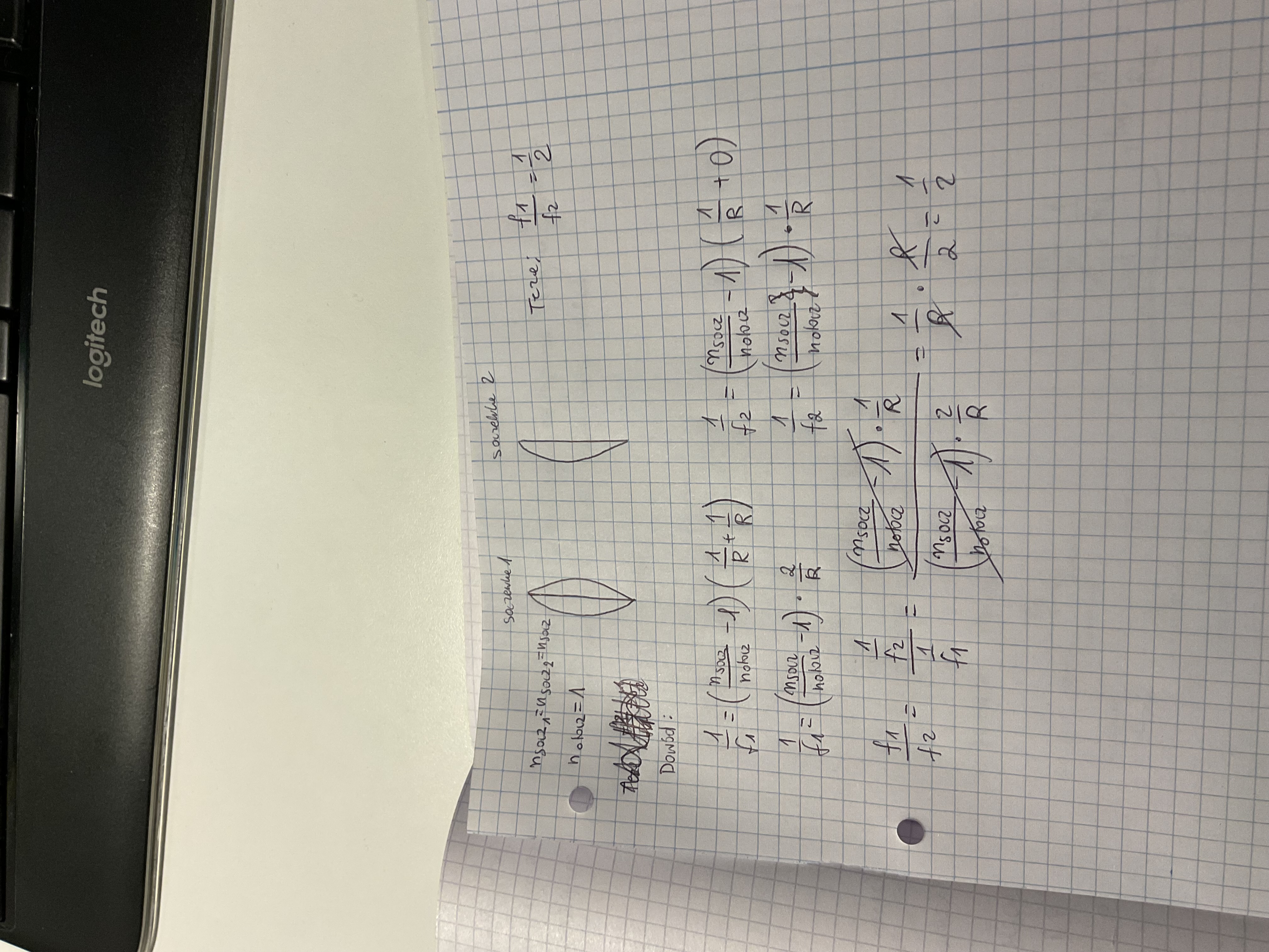To był któryś tam podpunkt tego zadania, a n otoczenia było podane w tej głównej treści i trzeba było wykazać że stosunek ogniskowych jest 1/2 i ja to zrobiłam tak jak na zdjęciu, ale nauczyciel w szkole wyzerował mi to zadanie, ponieważ w kluczu pod n otoczenia było podstawione to 1 a ja tego nie zrobiłam i skróciłam (to wszystko było w treści, że soczewki są w tym samym otoczeniu, że są wykonane z tych samych materiałów i mają te same promienie)