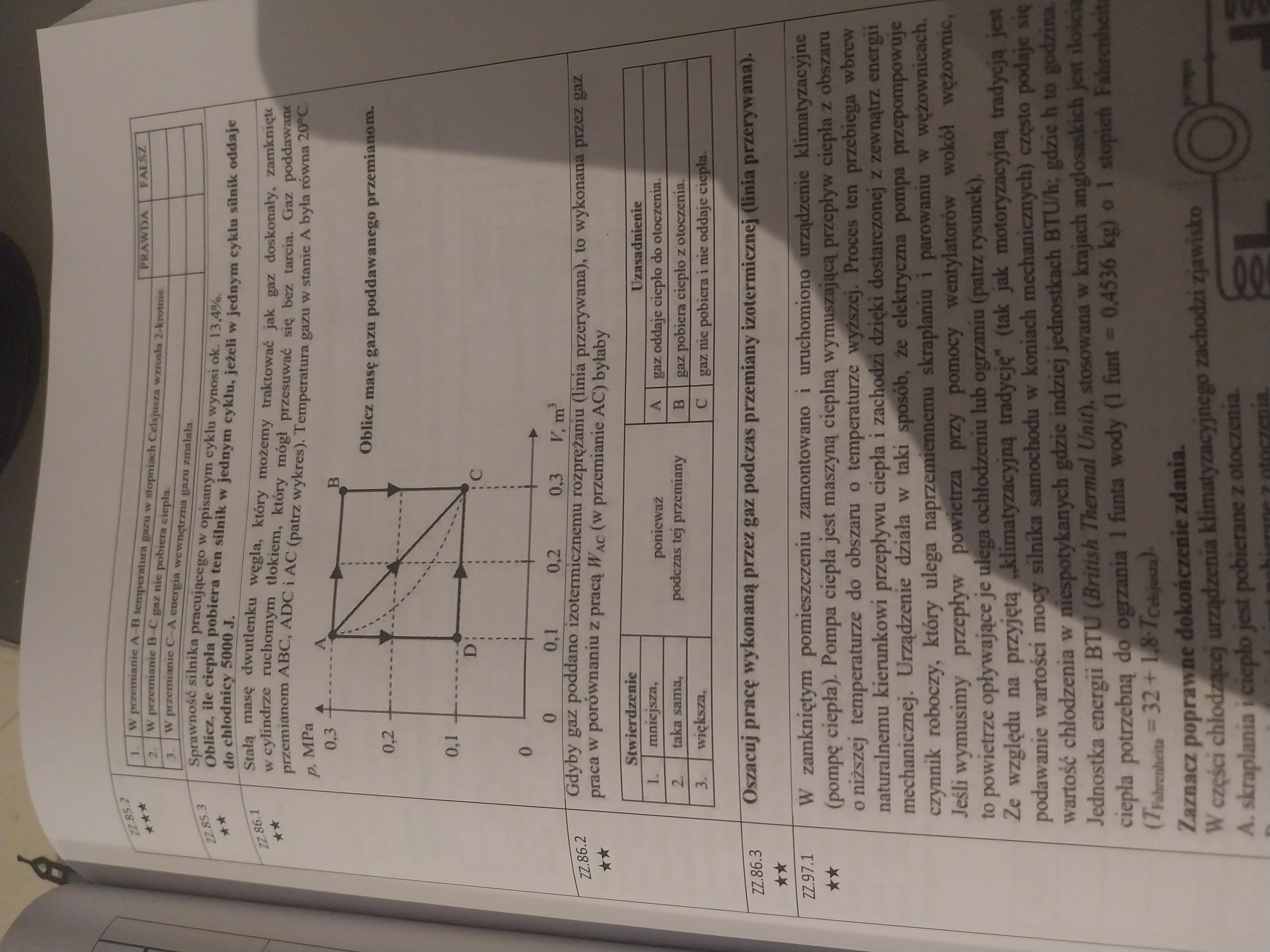 Pp 1): Korzystamy z równania Clapeyrona: pV = nRT i ponieważ mamy wyliczyć masę, to najlepiej tak jak robiliśmy to na zajęciach liczbę moli n zapisać jako m/Mmol, gdzie m to masa gazu, a Mmol to jego masa molowa (czyli masa na jeden mol gazu). Mamy zatem pV = mRT/Mmol, a stąd m = pV*Mmol/RT. p i V bierzemy z wykresu, T mamy w treści, R to stała gazowa. Tu jeszcze natomiast musimy sami określić Mmol dwutlenku węgla - ponieważ jest to CO2, to oznacza, to że trzeba wziąć masę molową dwóch atomów tlenu i jednego atomu węgla, czyli 2*16 g/mol + 12 g/mol = 44 g/mol (natomiast na maturze zawsze jak była do wykorzystania masa molowa to była ona podawana w treści, choć w istocie można ją samemu odczytać wykorzystując układ okresowy pierwiastków w karcie wzorów). No i mając to wszystko obliczamy m.