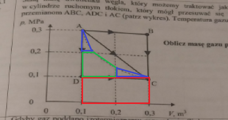 Pp 3): Faktycznie żeby zrobić to dokładnie to trzeba by całkować - ale na maturze oczywiście nie musimy umieć całek. W tej sytuacji trzeba jakoś szacować pole pod wykresem danej przemiany - wyraźnie zresztą wskazuje nam na to słowo w poleceniu ("oszacuj" - czyli godzimy się na pewne niedokładności). Można to np. zrobić tak jak poniżej, czyli że jest to np. suma pól czerwonego prostokąta, zielonego "ściętego" kwadratu i tych niebieskich trójkątów (umiemy je policzyć bo stanowią one określone ułamki jednego całego kwadratu, a jego pole znamy mając podane odpowiednie dane na osiach wykresu):