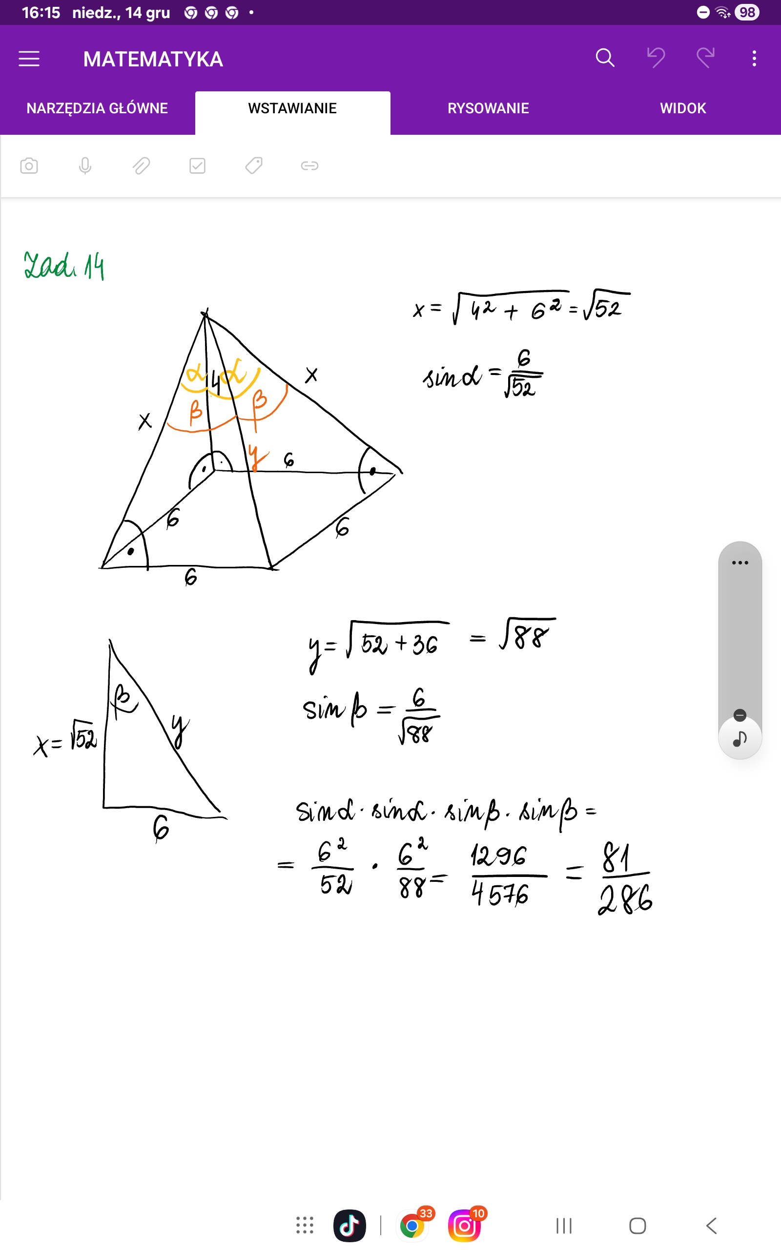 podstawa ostroslupa jest kwadrat o polu 36 jedna z krawedzi bocznych tej bryły ma długość 4 i jest prostopadła do obu krawędzi podstawy wychodzących z tego samego wierzchołka co ona. Oblicz iloczyn sinusów kątów płaskich przy wierzchołku tego ostrosłupa