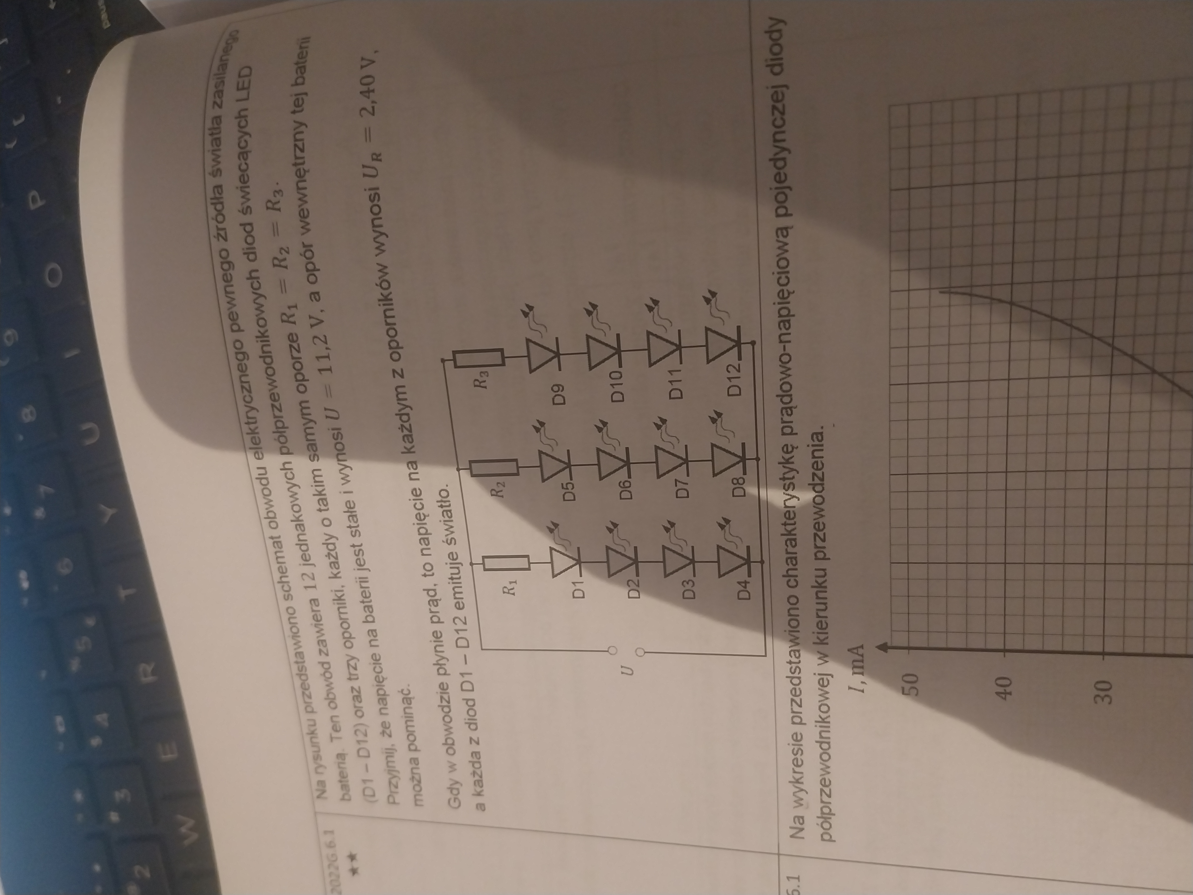 Każdą diodę należy potraktować po prostu jakiś element, który gdy przez układ płynie prąd elektryczny posiada pewien opór. I tak, np. z II prawa Kirchhoffa można łatwo obliczyć napięcie na każdej diodzie (wszystkie są takie same), a z załączonego wykresu będzie można zatem wyznaczyć natężenie prądu płynącego przez każdą diodę - z prawa Ohma mamy zatem opór każdej diody. Stąd znamy zatem już wszystkie parametry obwodu, więc wykorzystując wzór na moc możemy taką moc na każdym elemencie obliczyć.