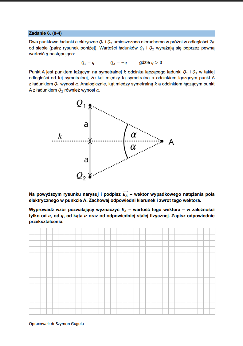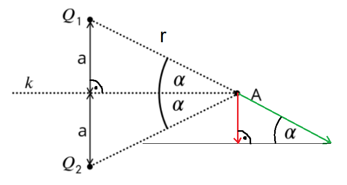Narysowałem sytuację poniżej. Z trygonometrii w trójkącie prostokątnym widzimy, że sin(alfa) = a/r, ale jednoczesnie w trójkącie zbudowanym z wektorów czerwonego i zielonego jest to stosunek długości wektora czerwonego do długości wektora zielonego. Wektor zielony to E, czyli po prostu wektor natężenia pochodzący od górnego ładunku Q. Wektor czerwony to jego pionowa składowa, czyli będzie to zatem E*sin(alfa). Tę samą operację należy powtórzyć dla wektora pochodzącego od dolnego ładunku Q i ostatecznie otrzymamy wówczas wektora Ea, który w istocie będzie równy dwukrotności długości czerwonego wektora, więc będzie to Ea = 2*E*sin(alfa).