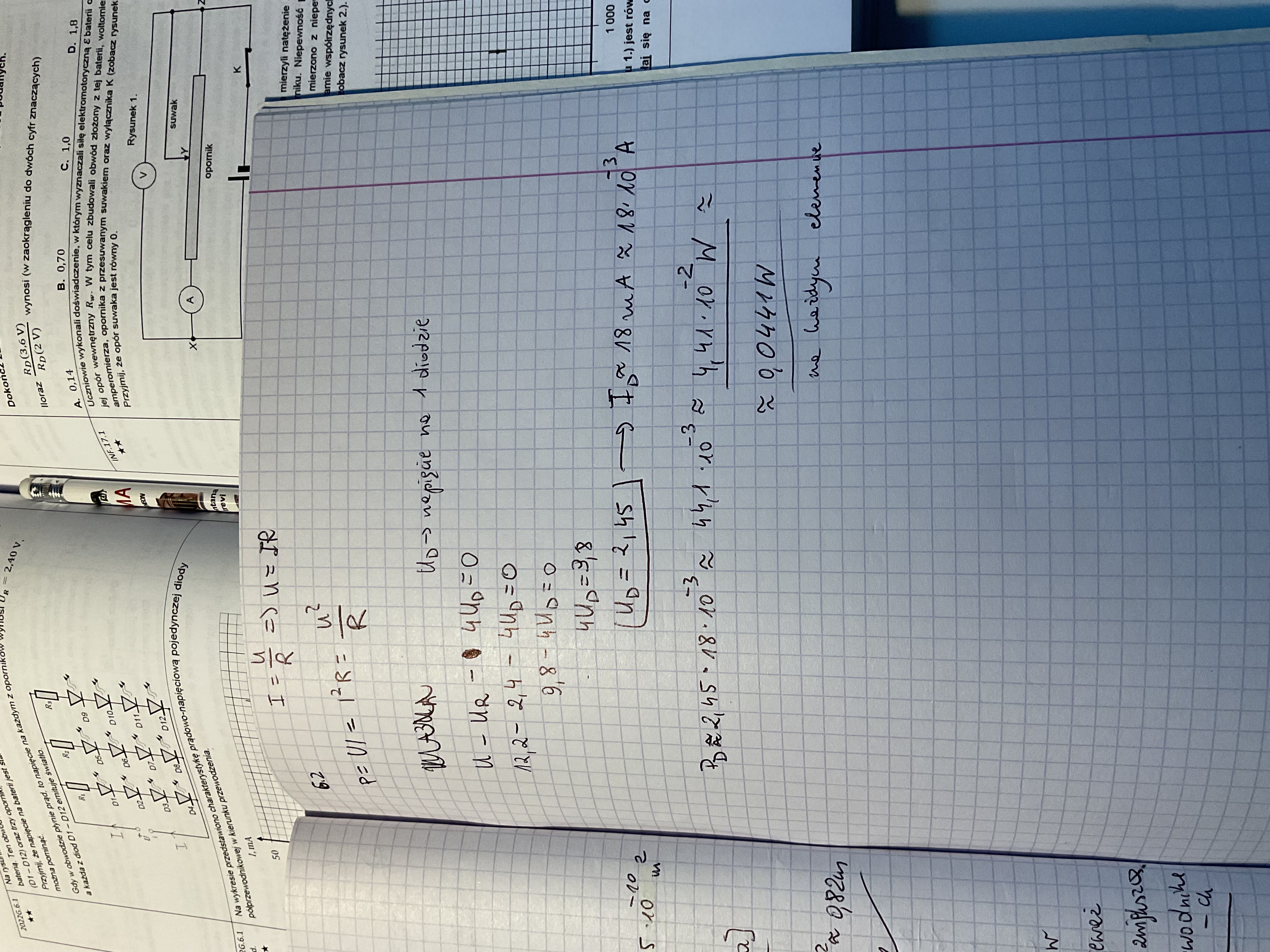 Pierwsza rzecz to bardzo drobna pomyłka - mianowicie zgodnie z treścią napięcie baterii to 11,2 V a nie 12,2 V, więc napięcie na diodzie powinno wyjśc równe 2,2 V, a nie 2,4 V, a co za tym idzie natężenie prądu płynącego przez każdą diodę to będzie zgodnie z wykresem 16 mA (a nie 18 mA). No i to przekłąda się na fakt, że moc na każdej diodzie to będzie 0,0352 W. Diod jest 12, więc moc na wszystkich diodach to 12*0,0352 W = 0,4224 W. Ale oprócz tego mamy jeszcze trzy oporniki, a na nich wydzielane moce będą już inne, ale liczymy je tak samo, tzn. jako iloczyn natezenie prądu i napięcie na tych opornikach, dla każdego z nich będzie to zatem 16 mA * 2,4 V. I jak dodasz do tych mocy na diodach moce na trzech opornikach to wyjdzie 0,54 W (tyle miało wyjść).