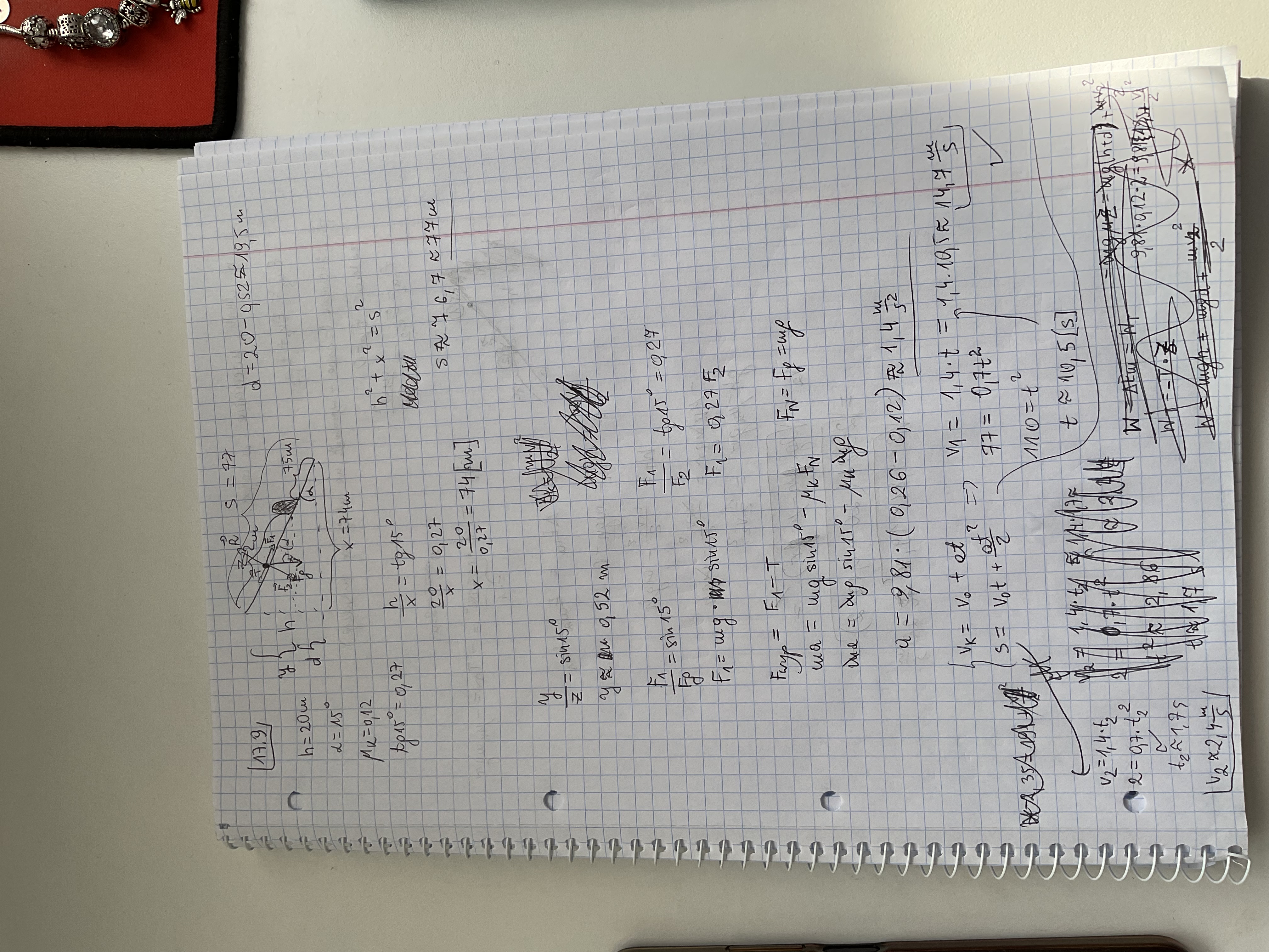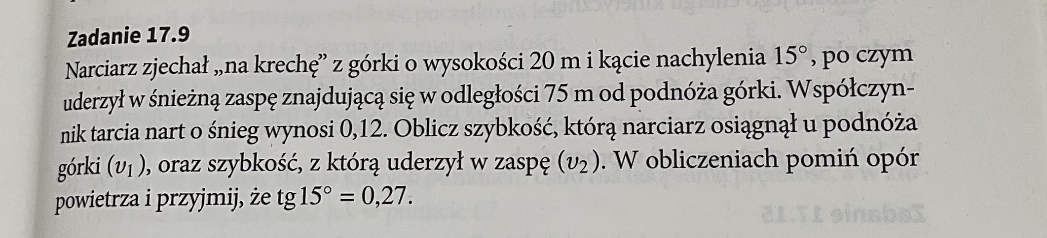 Ale v2 nie możesz liczyć jako a*t, bo tak by było wtedy gdyby ten drugi etap ruchu to też był ruch przyspieszony - a to jest przecież teraz ruch jednostajnie opóźniony, z inną wartością a niż w pierwszym etapie. Więc musisz przede wszystkim obliczyć przyspieszenie (opóźnienie) a w tym drugim etapie, gdy narciarz jedzie już po prostej, czyli ma = T = u*mg => a = u*g. No i teraz trzeba odpowiednio zapisać wzory na prędkość i drogę w ruchu jednostajnie opóźnionym, to będą odpowiednio: vk = v0 - at oraz s = v0t - at^2/2. v0 to tak naprawdę wyliczone już przez Ciebie v1 (jest to prędkość początkowa w drugim etapie ruchu), więc masz dwie niewiadome: vk i t. Musisz zatem rozwiązać ten układ równań tak by wyliczyć vk (robiliśmy to na pierwszych zajęciach kursu, najlepiej jest wyznaczyć t z pierwszego równania i wrzucić je do drugiego i tam wtedy całkiem ładnie wychodzi vk).